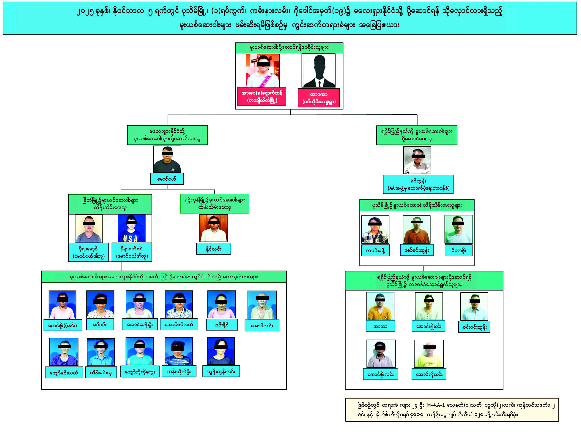ဖမ်းဆီးရမိတရားခံ နှစ်ဦး၏ ဖော်ထုတ်ချက်အရ နိုဝင်ဘာ ၆ ရက် နံနက်ပိုင်းတွင် ဆက်စပ်တရားခံများ ဖမ်းဆီးရမိရေး ဆောင်ရွက်ခဲ့ရာ ရန်ကုန်တိုင်းဒေသကြီး လမ်းမတော်မြို့နယ် ဇော်ဂျီလမ်းရှိ “ရွှေလမင်း” ဆေးရုံ၌ တရားခံ နိုင်လင်းအားလည်းကောင်း၊ ပုသိမ်မြို့နယ် (၉) ရပ်ကွက် ထင်းပုံဆိပ်ကျေးရွာ၌ တရားခံ ဇော်မင်းထွန်း (ခ) ညီပုအားလည်းကောင်း၊ တနင်္သာရီတိုင်းဒေသကြီး ကျွန်းစုမြို့နယ် မအိုင်ကျေးရွာအုပ်စု “ကောင်းကောင်း” ကဏန်းမွေးမြူရေးကန် အရှေ့ရေပြင်၌ မူးယစ်ဆေးဝါးပို့ဆောင် ရာတွင်အသုံးပြုသည့် “MV ရွှေလက်ဝါး” ကုန်တင်သင်္ဘော တစ်စင်းနှင့်အတူ လှေလုပ်သားများဖြစ်ကြသည့် မောင်စိုး (ပဲ့နင်း)၊ ခင်ဝင်း၊ အောင်ဆန်းဦး၊ အောင်ဇင်လတ်၊ ဝင်းနိုင်၊ အောင်လင်း၊ ကျော်မင်းလတ်၊ ဟိန်းမင်းသူ၊ ကျော်ကိုကိုထွေး၊ သန်းထိုက်ဦးတို့ ၁၀ ဦးအားလည်းကောင်း၊ ယင်းနေ့ ညနေပိုင်းတွင် ချောင်းသာမြို့ အမှတ် (၃) ရပ်ကွက်၌ တရားခံ ဝင်းဝင်းထွန်း (ခ) ဝင်းထွန်းအားလည်းကောင်း၊ ချောင်းသာမြို့ အမှတ် (၂) ရပ်ကွက် မြပုလဲသွယ်လမ်း၌ တရားခံ အောင်မျိုးဝင်း (ခ) မင်းသားကြီးအားလည်းကောင်း၊ ပုသိမ်မြို့နယ် သလပ်ခွာကျေးရွာအုပ်စု မော်တော်ကုန်းကျေးရွာ၌ တရားခံ အာဆာ (ခ) ဝတုတ်အားလည်းကောင်း၊ ယင်းနေ့ ညပိုင်းတွင် မြိတ်မြို့ နောက်လယ်ရပ်ကွက် ပိတောက်ရွှေဝါလမ်းရှိ ဘောဇဝတီဆန်ဆိုင်တွင် မူးယစ်ဆေးဝါးများ ထိန်းသိမ်းပေးသူ တရားခံ ဒိုရာစတီဗင် အားလည်းကောင်း ဖမ်းဆီးရမိခဲ့သည်။