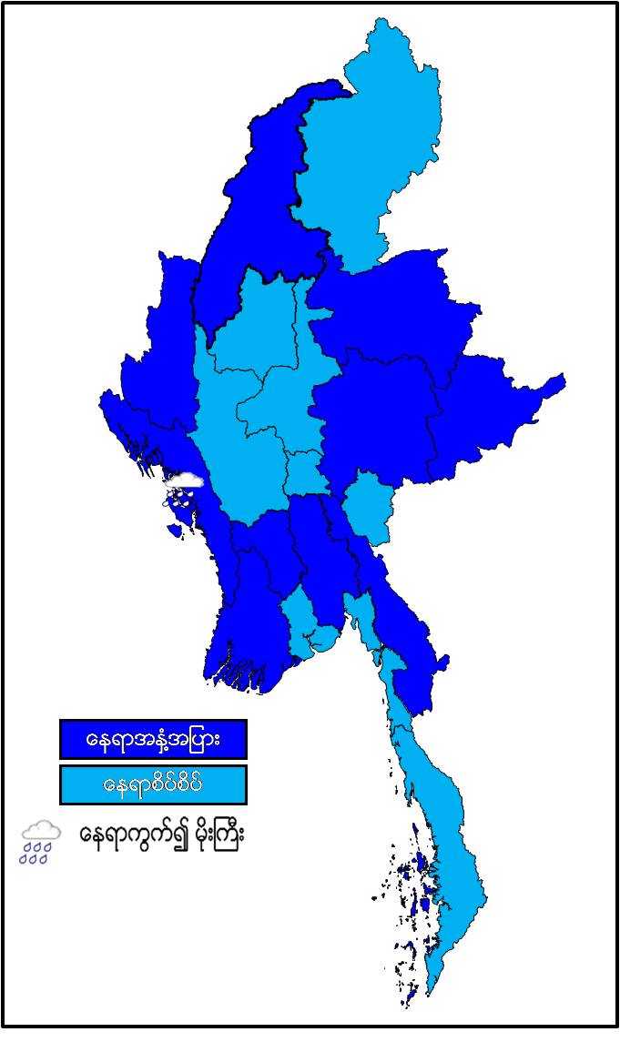 မနက်ဖြန်နံနက်အထိခန့်မှန်းချက်။ နေပြည်တော်၊ စစ်ကိုင်းတိုင်းဒေသကြီးအောက်ပိုင်း၊ မန္တလေးတိုင်းဒေသကြီး၊ မကွေးတိုင်းဒေသကြီး၊ ရန်ကုန်တိုင်းဒေသကြီး၊ တနင်္သာရီတိုင်းဒေသကြီး၊ ကချင်ပြည်နယ်၊ ကယားပြည်နယ်နှင့် မွန်ပြည်နယ်တို့တွင် နေရာစိပ်စိပ်နှင့် ကျန်တိုင်းဒေသကြီးနှင့် ပြည်နယ်တို့တွင် နေရာအနှံ့အပြားမိုးထစ်ချုန်းရွာပြီး၊ ရခိုင်ပြည်နယ်တွင်နေရာကွက်၍ မိုးကြီးနိုင်ပါသည်။ ရွာရန်ရာနှုန်းပြည့် ဖြစ်ပါသည်။