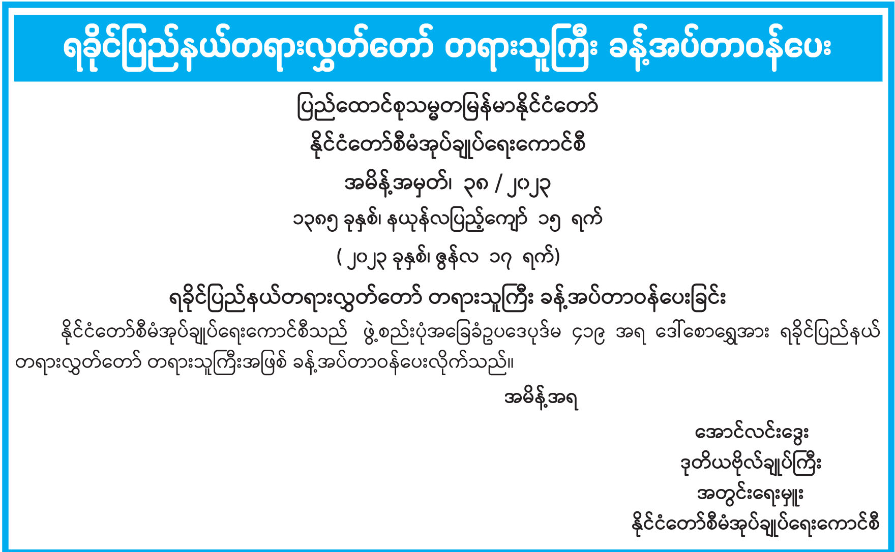 ရခိုင်ပြည်နယ်တရားလွှတ်တော် တရားသူကြီးချုပ် ခန့်အပ်တာဝန်ပေး