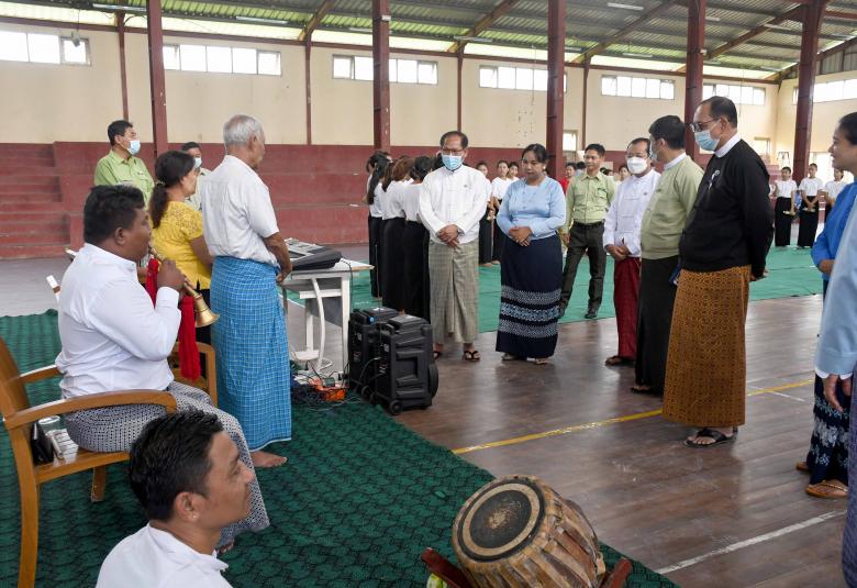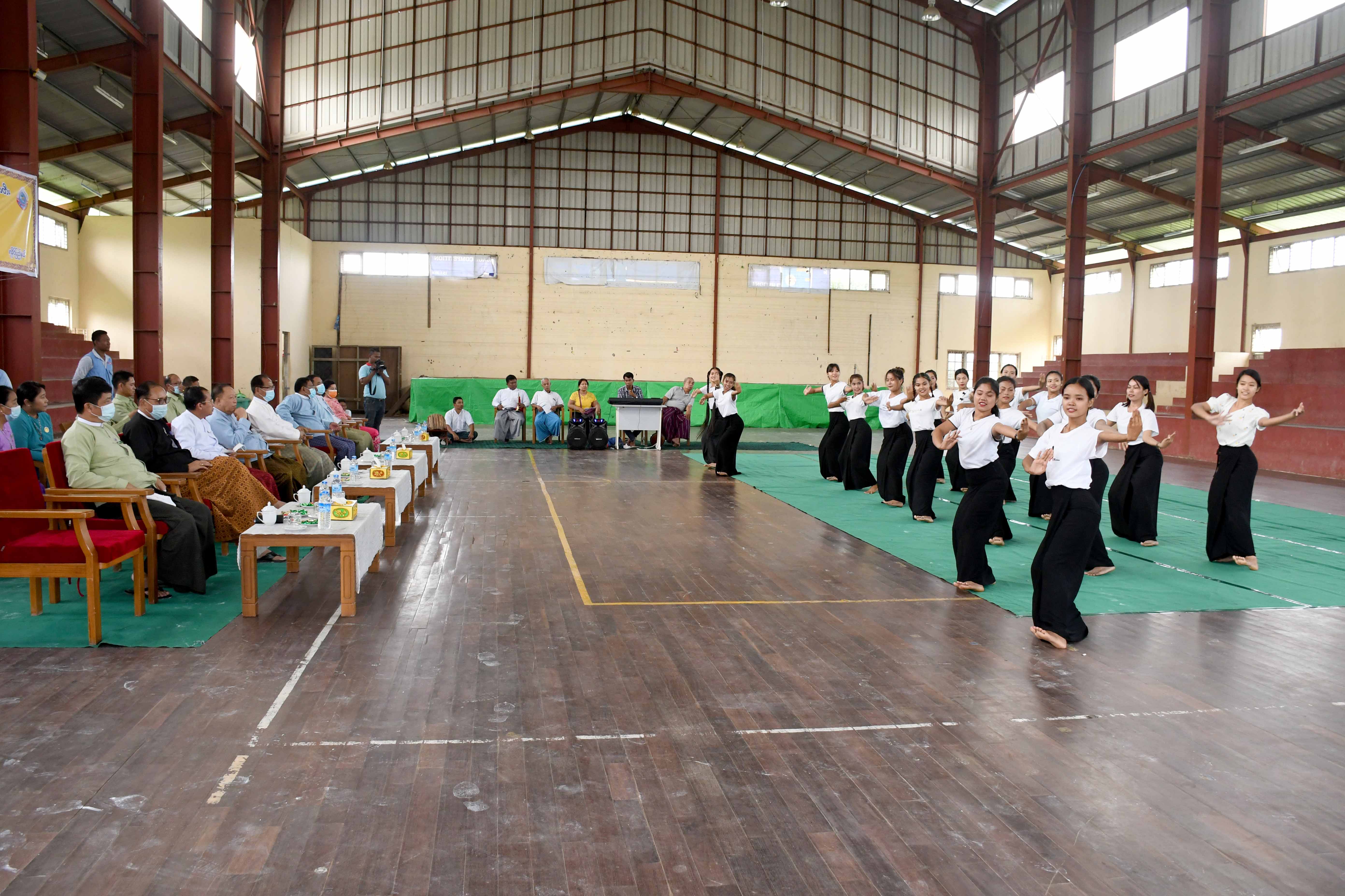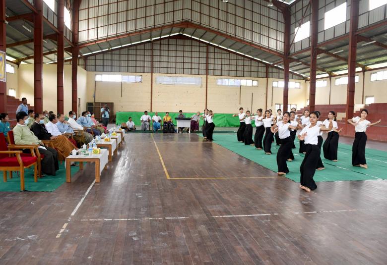 ဆက်လက်၍ ပြည်နယ်ဝန်ကြီးချုပ်နှင့်အဖွဲ့သည် စစ်တွေတက္ကသိုလ်၊ အားကစားခန်းမ၌ အကအဖွဲ့ဝင်များ စခန်းသွင်းလေ့ကျင့်နေမှုအား သွားရောက်ကြည့်ရှုအားပေးကြပြီး အကအဖွဲ့ဝင်များက အခြေခံကဗျာလွတ်အက၊ တစ်ဦးချင်းအကနှင့် မွန်ရိုးရာအကများဖြင့် လေ့ကျင့်ကပြဖျော်ဖြေကြသည်။ ထို့နောက် ပြည်နယ်ဝန်ကြီးချုပ်နှင့် တာဝန်ရှိသူများက အကအဖွဲ့ဝင်များကို အားပေးစကားပြောကြားကြပြီး အချိုရည်နှင့် စားသောက်ဖွယ်ရာများကို ပေးအပ်ခဲ့ကြသည်။