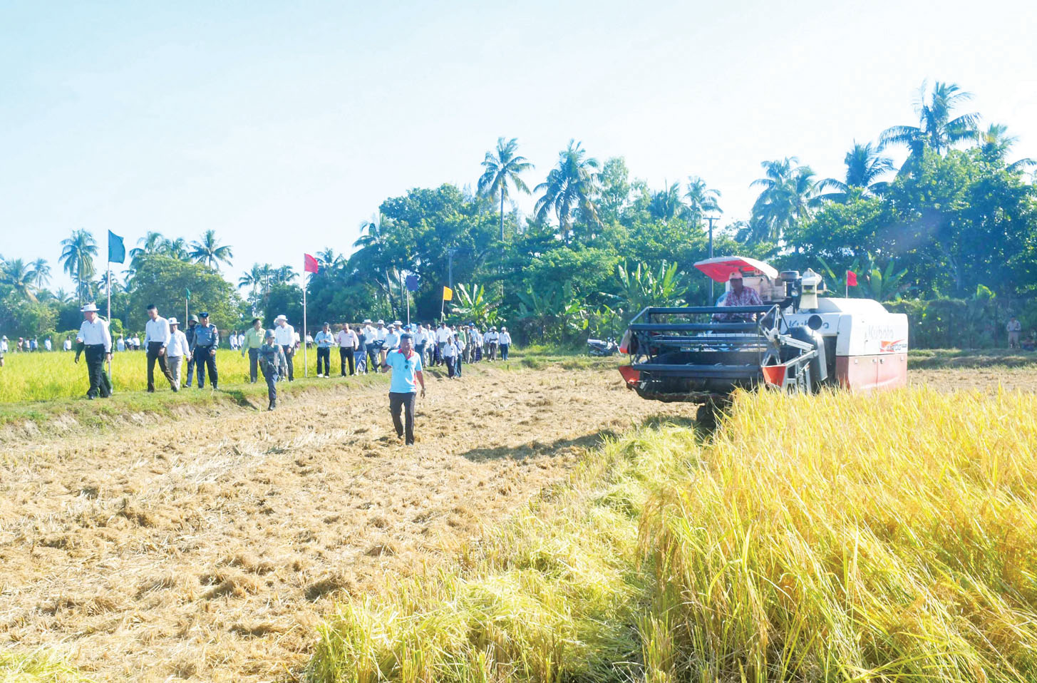 ထို့နောက် ပြည်နယ်ဝန်ကြီးချုပ်နှင့်အဖွဲ့သည် မိုးစပါးစံကွက်ရိတ်သိမ်းနေမှု၊ (Round Baler) ကောက်ရိုးထုံးစက်ဖြင့် ကောက်ရိုးထုံးခြင်းနှင့် (Rotary Mulcher) ရိုးပြတ်ဖြတ်ခြင်း ဆောင်ရွက်နေမှုတို့ကို ကြည့်ရှုအားပေးပြီး စိုက်ပျိုးရေးဦးစီးဌာနမှ ဝန်ထမ်းများက မိုးစပါးအထွက်နှုန်း တိုင်းတာတွက်ချက်နေမှုကို ကြည့်ရှုအားပေးသည်။