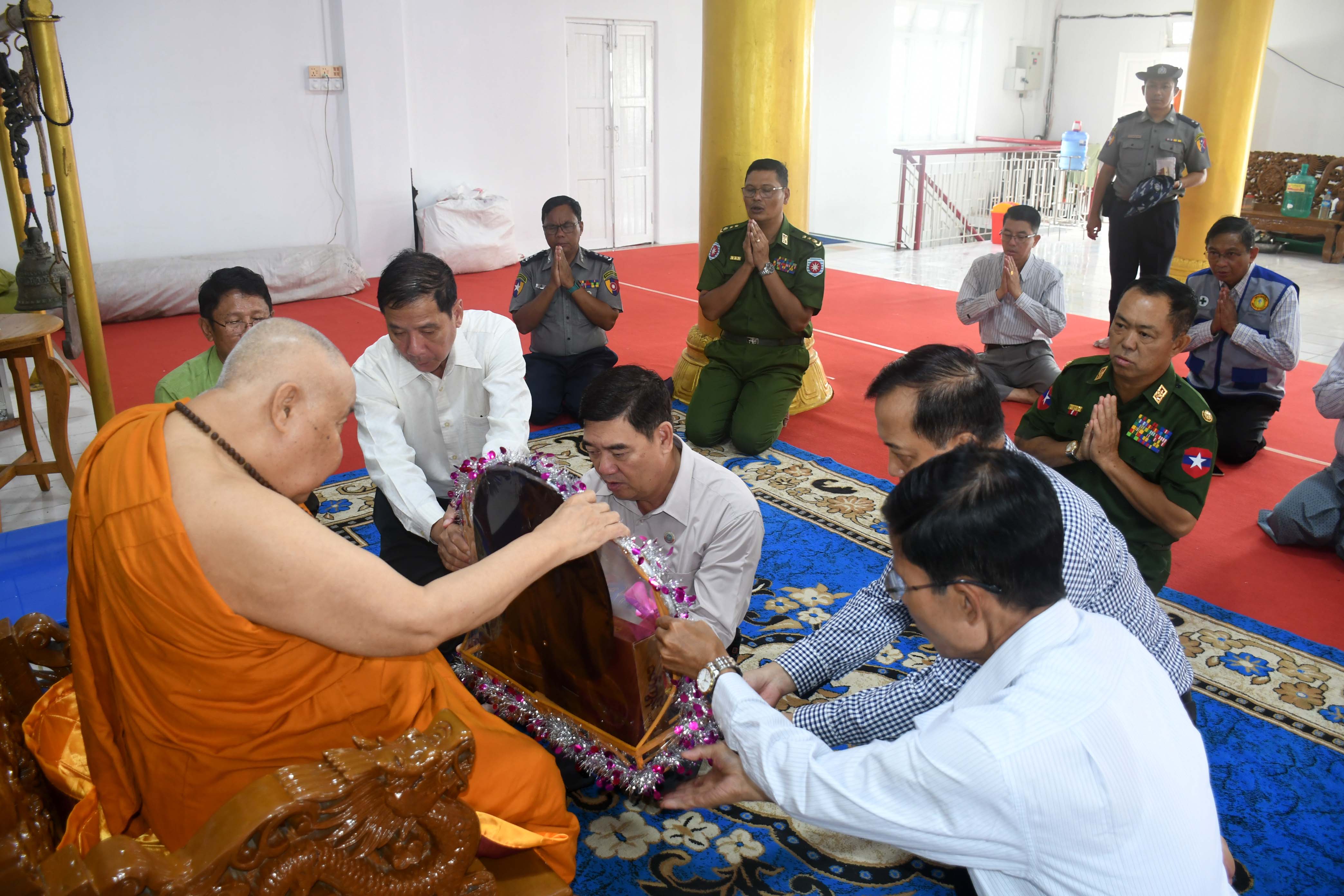 ဦးစွာ ပြည်နယ်ဝန်ကြီးချုပ်နှင့်အဖွဲ့သည် စစ်တွေမြို့၊ မဟာဇေယျသိဒ္ဓိအဓိဌာန်ကျောင်းတိုက်သို့ သွားရောက်၍ ဆရာတော်ကြီးအား ဖူးမြော်ကာလှူဖွယ်ဝတ္ထုပစ္စည်းများဆက်ကပ်ပြီး မုန်တိုင်းဒဏ် ကြောင့် ထိခိုက်ပျက်စီးခဲ့သည် သာသနိကအဆောက်ဦများအား ပြုပြင်နေမှုများကို မေးမြန်းလျှောက်ထားသည်။