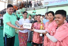 ဆက်လက်၍ ဆုပေးပွဲကိုကျင်းပရာ ရခိုင်ပြည်နယ်ဝန်ကြီးချုပ် ဦးထိန်လင်းနှင့်ဇနီး ပြည်နယ် အမျိုးသမီးရေးရာအဖွဲ့နာယက ဒေါ်ဆွေဆွေမြတ်တို့က ဆုရအသင်းများအား ဆုဖလားနှင့် ငွေသား ကျပ်(၅)သိန်းစီကို ပေးအပ်ချီးမြှင့်ပြီး နယ်စပ်ရေးရာဝန်ကြီးဌာန၊ ဒုတိယဝန်ကြီးနှင့် သမဝါယမ နှင့်ကျေးလက်ဖွံ့ဖြိုးရေးဝန်ကြီးဌာန၊ ဒုတိယဝန်ကြီးတို့က စစ်တွေတက္ကသိုလ်နှင့် နည်းပညာတက္ကသိုလ် များသို့ အားကစားပစ္စည်းများကို ထောက်ပံ့ပေးအပ်ခဲ့ကြကြောင်း သတင်းရရှိသည်။