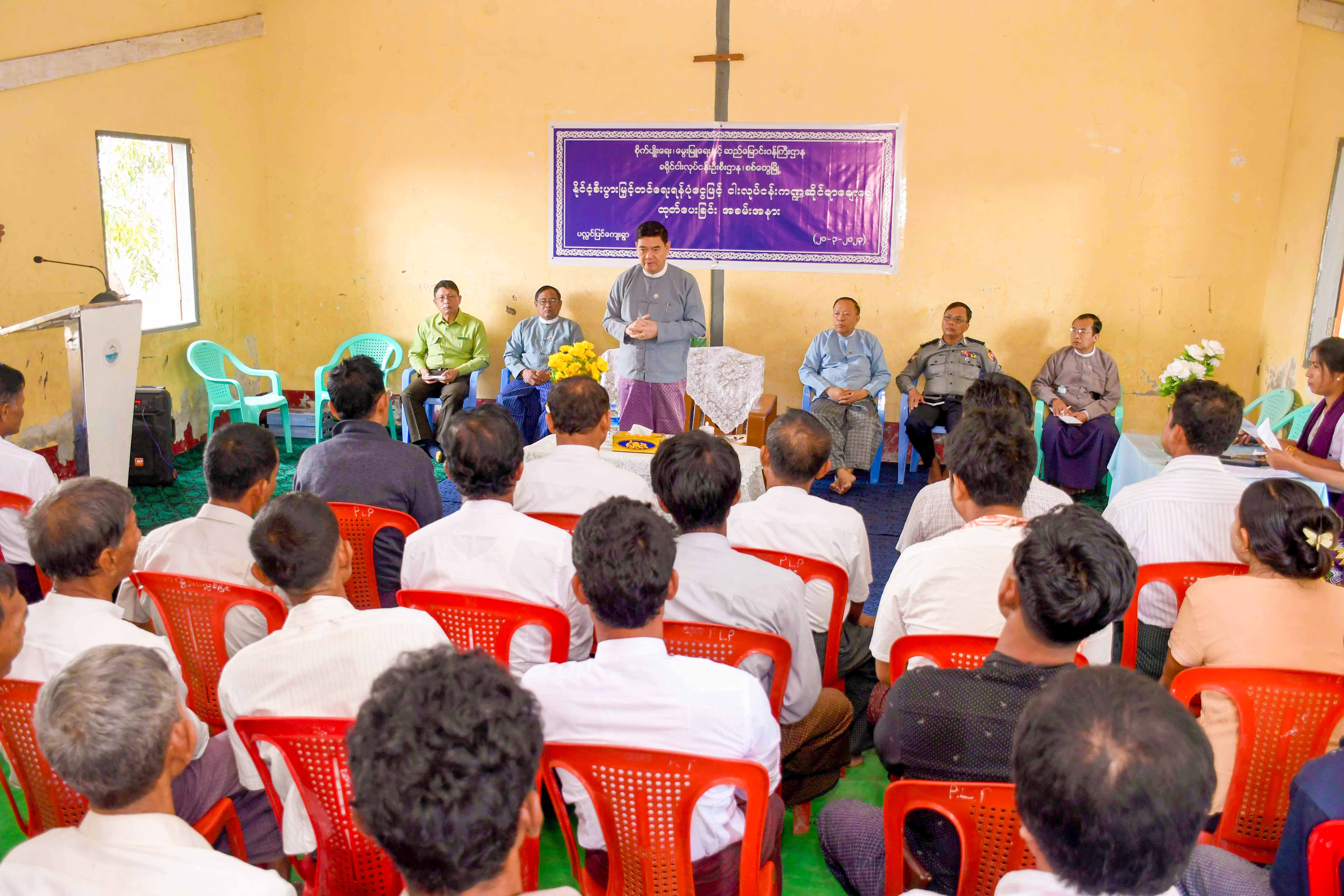 အခမ်းအနားတွင် ပြည်နယ်ဝန်ကြီးချုပ် ဦးထိန်လင်းက တိုင်းရင်းသားများ၏ လူမှုစီးပွားဘဝ ဖွံ့ဖြိုးတိုးတက်ရေးအတွက်၊ ငါးလုပ်ငန်းကဏ္ဍ ဖွံ့ဖြိုးတိုးတက်ရေးအစုအဖွဲ့အတွက် နိုင်ငံ့စီးပွားမြှင့်တင်ရေးရန်ပုံငွေမှ ချေးငွေထုတ်ချေးပေးခြင်းဖြစ်ကြောင်း၊ ယခုချေးငွေကို အစုအဖွဲ့များဖြင့်၊ ကြီးကြပ်မှုကော်မတီများဖြင့် မပျောက်မပျက်ရအောင် အဓိကအားဖြင့် တိုးပွားလာအောင် ဆောင်ရွက်သွားကြရမည်ဖြစ်ကြောင်း၊ မိမိဒေသ၊ မိမိရပ်ရွာတွင်ရှိသော စိုက်ပျိုးရေး၊ မွေးမြူရေးလုပ်ငန်းများကို ယခင်ထက် အထွက်နှုန်းကောင်းအောင်၊ ယခင်ထက် တိုးပွားလာအောင် ဆောင်ရွက်ကြရမည်ဖြစ်ကြောင်း၊ မိသားစုတစ်စုချင်း ဖွံ့ဖြိုးတိုးတက်လာမှ မိမိရပ်ရွာ၊ မိမိဒေသ ဖွံ့ဖြိုးတိုးတက်လာမည်ဖြစ်ကြောင်းနှင့် ယခုမိမိတို့ ပေးအပ်ထားသည့် ငွေများအပေါ်တွင် ဆထက်တိုးပွားအောင်ရွက်ခြင်းဖြင့် မိသားစုလူမှုစီးပွားဘဝ ဖွံ့ဖြိုးတိုးတက်နိုင်ကြပါစေကြောင်း ပြောကြားသည်။ ဆက်လက်၍ ရခိုင်ပြည်နယ် ငါးလုပ်ငန်းဦးစီးဌာနမှ ဒုတိယညွှန်ကြားရေးမှူး ဦးဦးထွန်းသိန်းက နိုင်ငံ့စီးပွားမြှင့်တင်ရေးရန်ပုံငွေမှ ချေးငွေပေးအပ်ရခြင်းနှင့်ပတ်သက်၍ ရှင်းလင်းတင်ပြသည်။