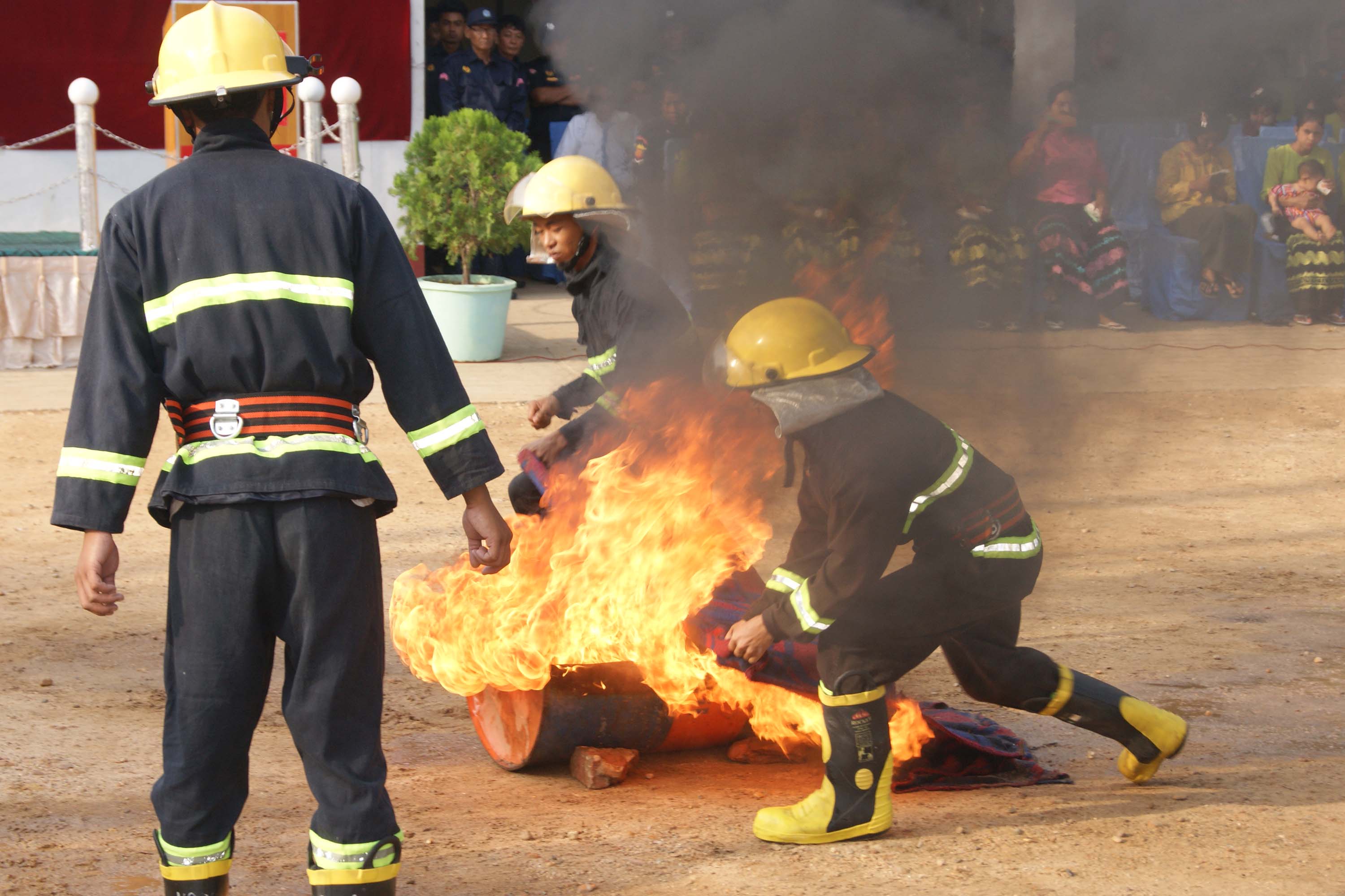 ထို့နောက် မီးသတ်တပ်ဖွဲ့ဝင်များက အပေါ့စား မီးသတ်စက်ကလေး သရုပ်ပြခြင်း၊ ဂက်စ်အိုးမီးငြှိမ်းသတ်မှု သရုပ်ပြခြင်း၊ မီးသတ်စက်ကြီးဖြင့် လက်တွေ့မီးငြှိမ်းသတ်မှု သရုပ်ပြခြင်း၊ ဖုံးအုပ်မီးငြှိမ်းသတ်မှု သရုပ်ပြခြင်း၊ ရှာဖွေကယ်ဆယ်ရေး (ကားအက်စီးဒင့်) သရုပ်ပြခြင်း၊ HNE ကိရိယာဖြင့် လက်တွေ့မီးငြှိမ်းသတ်မှု သရုပ်ပြခြင်း၊ အခန်းတွင်း မီးခိုးပိတ်မိလူနာအား ကယ်ဆယ်ရှာဖွေမှု သရုပ်ပြခြင်း၊ မီးကာဝတ်စုံဖြင့် သရုပ်ပြခြင်းတို့ကို လက်တွေ့ပြသခဲ့သည်။