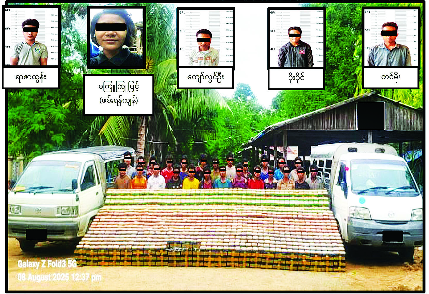 လုံခြုံရေးတပ်ဖွဲ့ဝင်များ ပါဝင်သော ပူးပေါင်းအဖွဲ့သည် ဩဂုတ် ၇ ရက် နံနက်ပိုင်းတွင် သတင်းအရ ရမည်းသင်းမြို့နယ် အင်တိုင်းကျေးရွာအုပ်စု ကင်းကျေးရွာအနီးတွင် တင်မိုး မောင်းနှင်သည့် BGO-11 9P--- MAZDA BONGO ယာဉ်နှင့် ရာဇာထွန်း မောင်းနှင်သည့် SGG-20 8K--- I ZONE ယာဉ် နှစ်စီးပေါ်သို့ ဘိန်းဖြူပါဆပ်ပြာခွက်များ ထုပ်ပိုးထားသည့် ပီနံအိတ်များတင်နေစဉ် ရှာဖွေစစ်ဆေးခဲ့ရာ ဒေသကာလ တန်ဖိုးငွေကျပ် ၄ ဒသမ ၂၉ ဘီလီယံတန်ဖိုးရှိ ဘိန်းဖြူ ၁၇၁ ဒသမ ၆ ကီလိုနှင့်အတူ တာဝန်ခံသယ်ဆောင်လာသူ တံတားဦးမြို့နယ်နေ ကျော်လွင်ဦးနှင့် မော်တော်ယာဉ်များပေါ်သို့ မူးယစ်ဆေးဝါးများ တင်ဆောင်ပေးသူများဖြစ်သည့် ကလောမြို့နယ်နေ ဖိုးပိုင်ပါ ၂၂ ဦးတို့ကို ဖမ်းဆီးရမိခဲ့ကြောင်း၊ စစ်ဆေးပေါ်ပေါက်ချက်များအရ ဖမ်းဆီးရမိ ဘိန်းဖြူများကို ကလောမြို့နယ်မှ ရမည်းသင်းမြို့နယ်သို့ သယ်ဆောင်ခိုင်းသူမှာ ချစ်သူ (ဖမ်းဆီးရန်ကျန်တရားခံ) ဖြစ်ပြီး ၎င်း၏ စေခိုင်းချက်အရ ဖိုးပိုင်ပါ ၂၂ ဦးတို့သည် ကလောမှ ရမည်းသင်းသို့ သယ်ဆောင်လာခြင်းဖြစ်ကြောင်း၊ ရမည်းသင်းမှ မန္တလေးသို့ တာဝန်ခံသယ်ဆောင်ခိုင်းသူ ကြူကြူမြင့် (ဖမ်းဆီးရန်ကျန်တရားခံ) ဖြစ်ကြောင်းသိရသဖြင့် ၎င်းတို့အား ဥပဒေအရ အရေးယူထားရှိပြီး ကွင်းဆက်ပြစ်မှုကျူးလွန်သူများအား ဆက်လက်ဖော်ထုတ်လျက်ရှိကြောင်း သတင်းရရှိသည်။