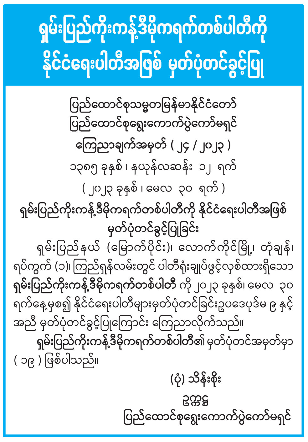 ရှမ်းပြည်ကိုးကန့်ဒီမိုကရက်တစ်ပါတီကို နိုင်ငံရေးပါတီအဖြစ် မှတ်ပုံတင်ခွင့်ပြု