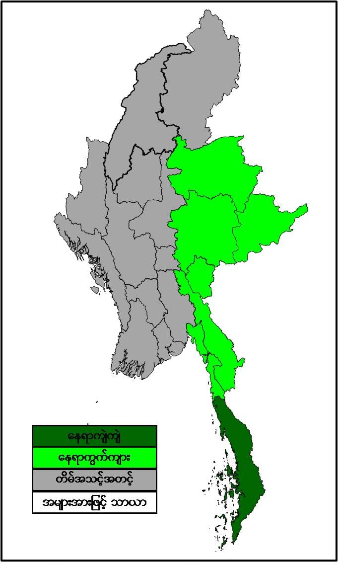 မနက်ဖြန်နံနက်အထိခန့်မှန်းချက်မှာ တနင်္သာရီတိုင်းဒေသကြီးတွင် နေရာကျဲကျဲနှင့် ရှမ်းပြည်နယ်၊ ကယားပြည်နယ်၊ ကရင်ပြည်နယ်နှင့် မွန်ပြည်နယ်တို့တွင် နေရာကွက်ကျား မိုးထစ်ချုန်းရွာမည်။ ရွာရန်ရာနှုန်း(၈၀) ဖြစ်သည်။ ကျန်တိုင်းဒေသကြီးနှင့် ပြည်နယ်တို့တွင် တိမ်အသင့်အတင့် ဖြစ်ထွန်းမည်။