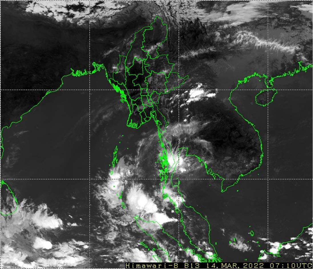 ဘင်္ဂလားပင်လယ်အော်အခြေအနေမှာ ကပ္ပလီပင်လယ်ပြင်နှင့် ဘင်္ဂလားပင်လယ်အော်အနောက် တောင်ပိုင်းတို့တွင် တိမ်အသင့်အတင့်မှ တိမ်ထူထပ်နေပြီး ကျန်ဘင်္ဂလားပင်လယ်အော်တွင် တိမ်အနည်းငယ် ဖြစ်ထွန်းနေသည်။