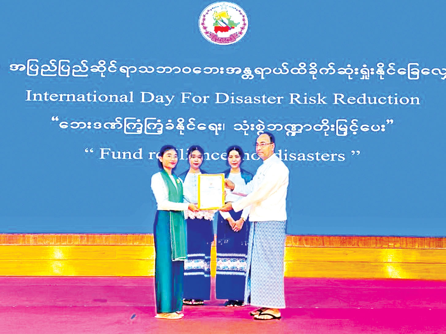 ထို့နောက်   ၂၀၂၅ ခုနှစ်   အပြည်ပြည်ဆိုင်ရာ သဘာဝဘေးအန္တရာယ် ထိခိုက်ဆုံးရှုံးနိုင်ခြေလျှော့ချရေးနေ့အထိမ်းအမှတ် စာစီစာကုံးပြိုင်ပွဲတွင် ဆုရရှိသည့်ကျောင်းသားကျောင်းသူများအား ဆုများချီးမြှင့်ပေးအပ်ပြီး  ကုလသမဂ္ဂအထွေထွေ အတွင်းရေးမှူးချုပ်၏   သဝဏ်လွှာသတင်းစကားရုပ်သံ   Video Message ကိုပြသကာ ခန်းမအတွင်း ခင်းကျင်းပြသထားသော သဘာဝဘေး အသိပညာပေးပြခန်းများကို လှည့်လည်ကြည့်ရှုအားပေးသည်။