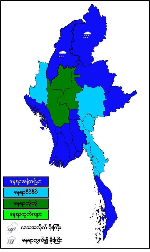 လာမည့် စနေ၊တနင်္ဂနွေအားလပ်ရက်များအတွက် မိုးလေဝသခန့်မှန်းချက်မှာ   နေပြည်တော်နှင့် ရန်ကုန်တိုင်းဒေသကြီးတို့တွင် နေရာအနှံ့အပြားနှင့် မန္တလေးတိုင်းဒေသကြီးတွင် နေရာကျဲကျဲ မိုးထစ်ချုန်းရွာမည်။