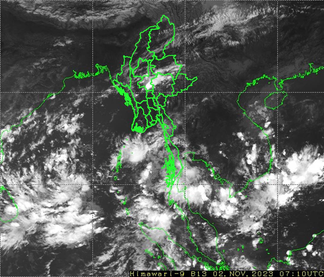 ဘင်္ဂလားပင်လယ်အော်အ‌ခြေအနေ။ ကပ္ပလီပင်လယ်ပြင်နှင့် ဘင်္ဂလားပင်လယ်အော်တောင်ပိုင်းတို့တွင် တိမ်ထူထပ်နေပြီး၊ ကျန်ဘင်္ဂလားပင်လယ်အော် တွင် တိမ်အသင့်အတင့် ဖြစ်ထွန်းနေပါသည်။