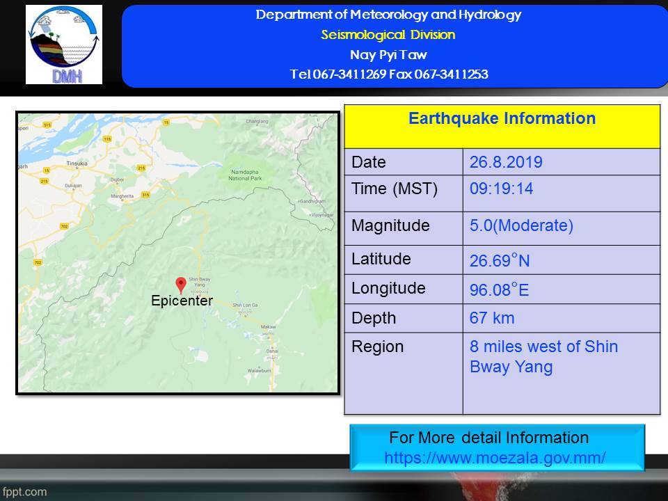 အဆိုပါ မြေငလျင်သည် မြောက်လတ္တီတွဒ် (၂၆.၆၉)ဒီဂရီ၊ အရှေ့လောင်ဂျီတွဒ် (၉၆.ဝ၈)ဒီဂရီ၊ အနက် (၆၇) ကီလိုမီတာခန့်ကို ဗဟိုပြု၍ ုလှုပ်ရှားခဲ့ခြင်းဖြစ်ကြောင်း သိရသည်။