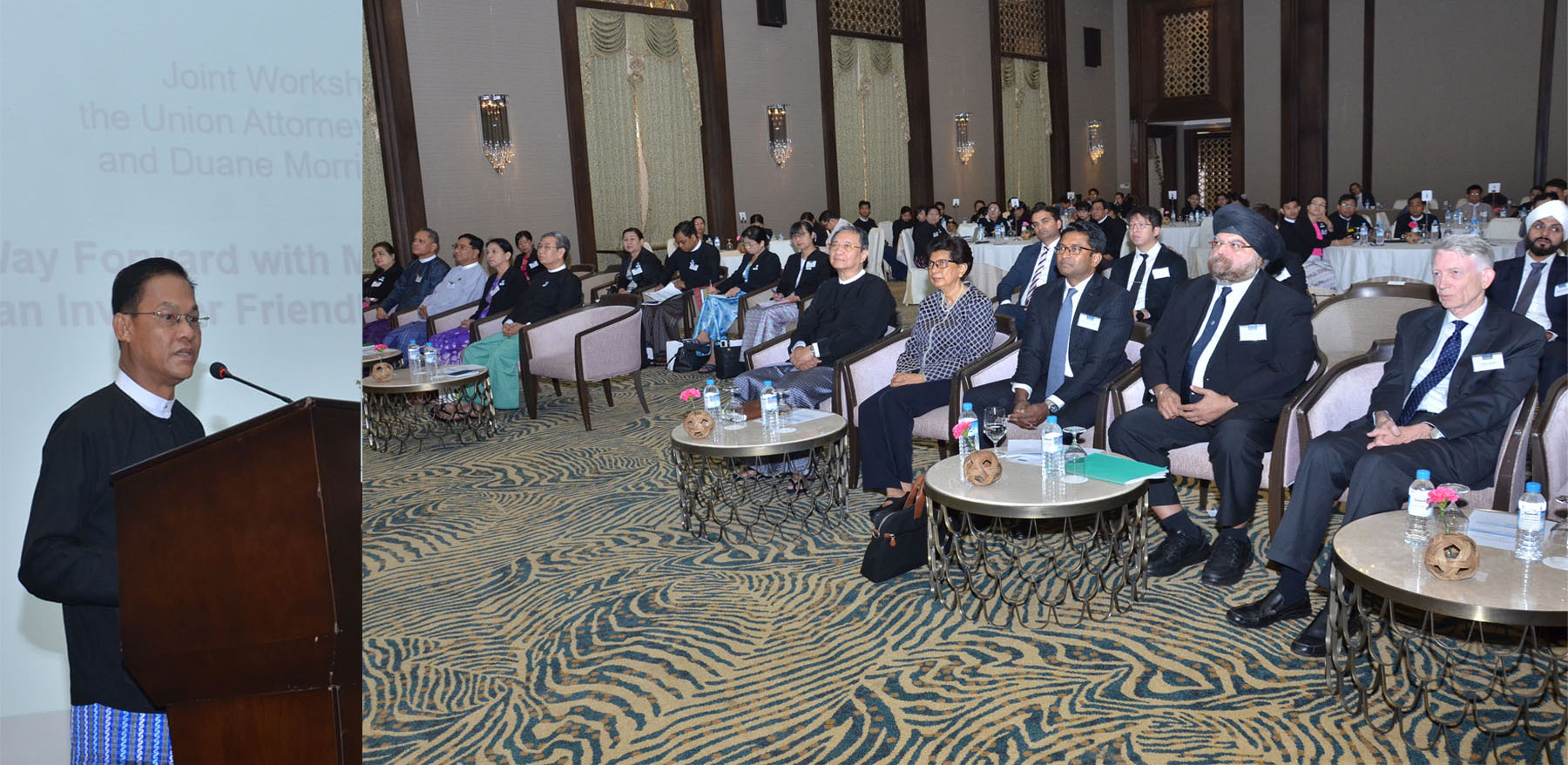 ပြည်ထောင်စုရှေ့နေချုပ်ရုံးနှင့် အမေရိကန်နိုင်ငံအခြေစိုက် Duane Morris & Selvam LLP တို့ပူးပေါင်း၍ ရင်းနှီးမြှုပ်နှံမှုနှင့် စီးပွားရေးလုပ်ငန်း ဥပဒေများဆိုင်ရာ အလုပ်ရုံဆွေးနွေးပွဲကို ယနေ့နံနက် နာရီတွင် နေပြည်တော်ရှိ Kempinski Hotel ကျင်းပသည်။