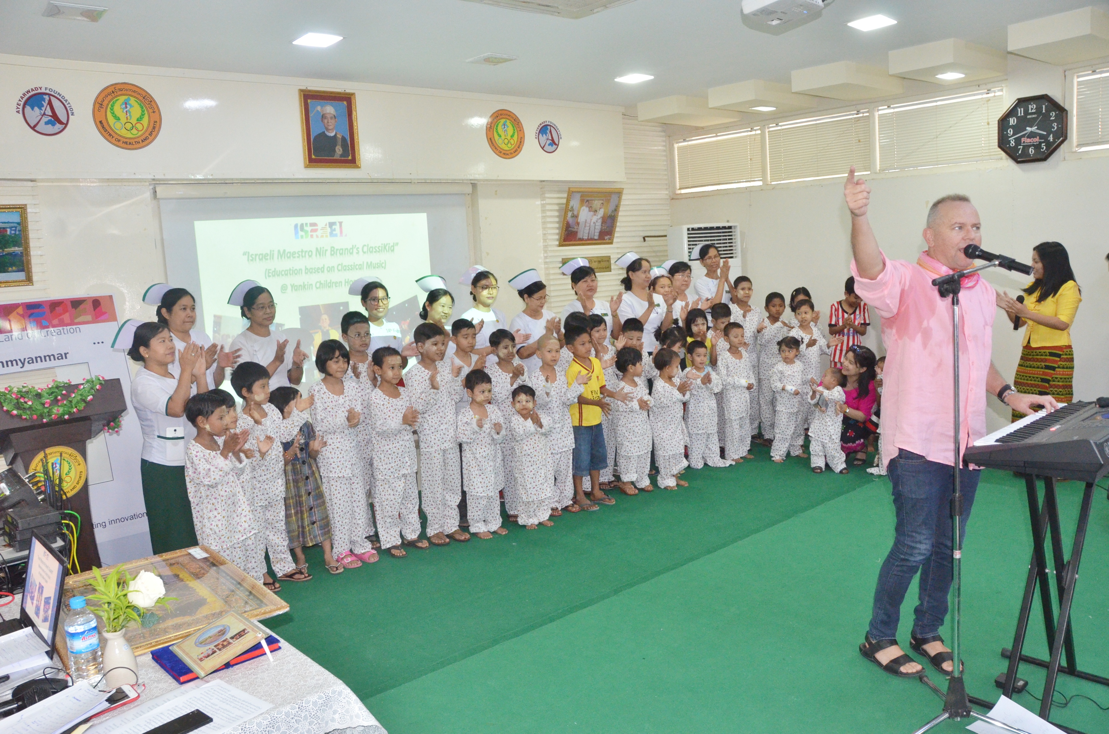 ကျန်းမာရေးနှင့်အားကစားဝန်ကြီးဌာန၊ကုသရေးဦးစီးဌာန၊ရန်ကုန်တိုင်းဒေကြီးရှိရန်ကင်းကလေးဆေးရုံကြီး၌တက်ရောက်ဆေးကုသမှုခံယူနေသော ကလေးလူနာများအား ယနေ့ မွန်းလွဲ ၂ နာရီ ခွဲက Israeli Maestro Nir Brand’s Classikid အဖွဲ့က လာရောက် ဖျော်ဖြေခဲ့ကြသည်။