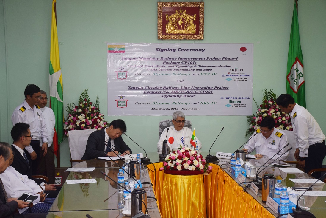 ထို့နောက် မြန်မာ့မီးရထား ဦးဆောင်ညွှန်ကြားရေးမှူး ဦးသူရိန်ဝင်းနှင့် FNS JV နှင့် NKS JV Co.,Ltd တို့မှ General Manager Mr.Eita Fujikawa တို့သည် ရန်ကုန်-ပဲခူး ရထားလမ်းပိုင်းနှင့်ရန်ကုန်မြို့ပတ်ရထားလမ်းပိုင်း အဆင့်မြှင့်တင်ခြင်း လုပ်ငန်း၏မြို့ပြနှင့်သံလမ်းဆိုင်ရာလုပ်ငန်း၊ အချက်ပြနှင့်ဆက်သွယ်ရေးဆိုင်ရာ လုပ်ငန်းတပ်ဆင်ခြင်းဆိုင်ရာ ကန်ထရိုက်စာချုပ်ကို ဒုတိယဝန်ကြီး ဦးကျော်မျိုး ၏ရှေ့မှောက်၌ လက်မှတ်ရေးထိုးကြပြီး အပြန်အလှန်လဲလှယ်ကြသည်။
