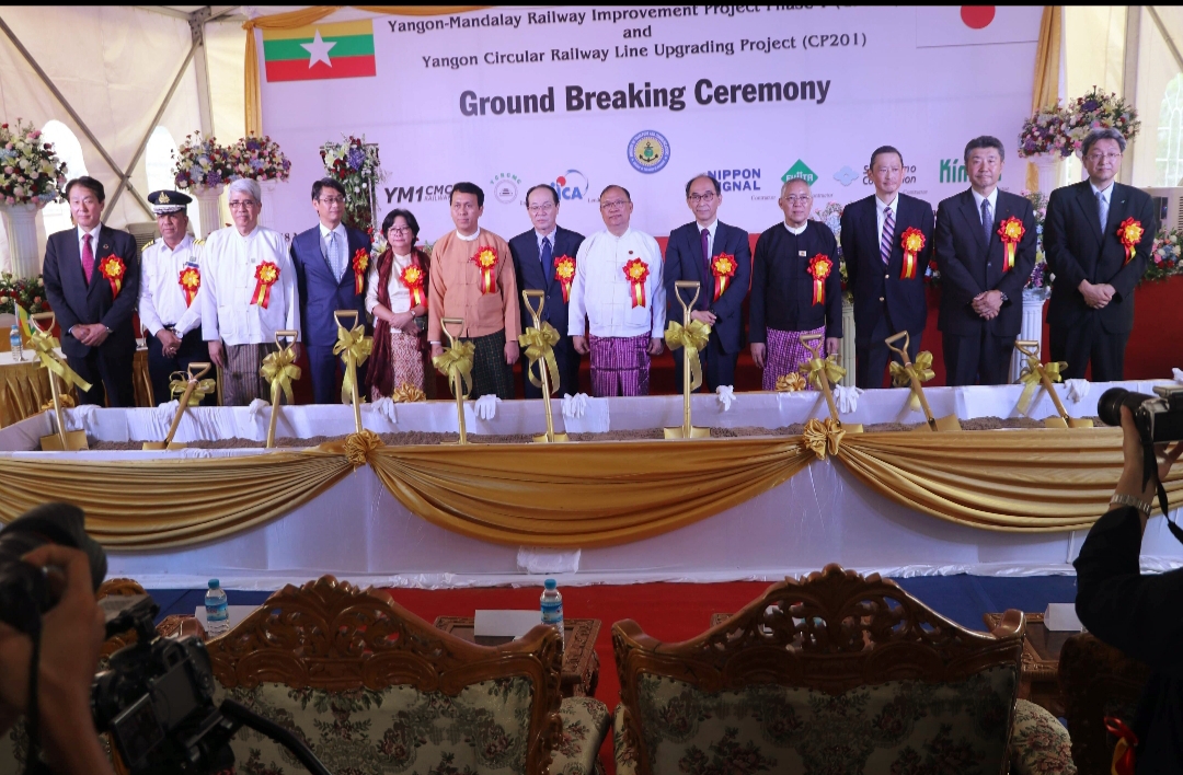 ရန်ကုန်-မန္တလေး မီးရထားလမ်း အဆင့်မြှင့်တင်ရေးစီမံကိန်း (အဆင့်-၁)၏ ရထားလမ်း/ တံတားများ အဆင့်မြှင့်တင်ခြင်း၊ အချက်ပြစနစ်သစ်များ တပ်ဆင်ခြင်းလုပ်ငန်းနှင့် ရန်ကုန်မြို့ ပတ်လမ်းပိုင်း (CP-201) တို့အား မြေပြင်တည်ဆောက်ရေးလုပ်ငန်းများ စတင်ဆောင်ရွက်ခြင်း အခမ်းအနားကို ယနေ့ နံနက် ၁၀ နာရီခွဲတွင် ရန်ကုန်ဘူတာကြီးယာဒ်ဝင်း၌ ကျင်းပသည်။