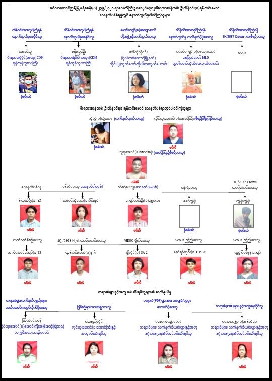ပြစ်မှုကျူးလွန်သူများအပေါ် စစ်ဆေးပေါ်ပေါက်ချက်များအရ ၎င်းတို့အနေဖြင့် စိတ်ကြွ မူးယစ်ဆေးဝါးများ သုံးစွဲပြီး အကြမ်းဖက်မှုလုပ်ရပ်များအား ကျူးလွန်ခဲ့ကြကြောင်း တွေ့ရှိရပြီး မီးရထားဝန်ထမ်း ဦးထိန်ဝင်း ( ခ ) ရန်ကင်းမောင်အား လုပ်ကြံသတ်ဖြတ်မှုတွင် နောက်ကွယ်မှ ပါဝင်ကြသူများမှာ CDM ပြုလုပ်ထားသူ၊ အောင်သူ ရန်ကုန်ဘူတာကြီး ( မီးရထားရုံပိုင်အထူး ) ( ဖမ်းဆီးရန်ကျန် ) နှင့် CDM ပြုလုပ်ထားသူ၊ စန်းလွင်ဦး ရန်ကုန်ဘူတာကြီး ( မီးရထားရုံပိုင်အထူး ) ( ဖမ်းဆီးရန်ကျန် ) တို့ဖြစ်ပြီး ၎င်းတို့ကျူးလွန်သူများအား လက်နက်ပံ့ပိုးပေးရန် ဒေါ်လဲ့လဲ့ဝင်း ( NLD ) ပါတီမှ ဗိုလ်တထောင်မြို့နယ် ၊ တိုင်း-၂ လွှတ်တော် ကိုယ်စားလှယ်ဟောင်း ( ဖမ်းဆီးရန်ကျန် ) မှ မောင်ကျော် ( ခ ) ဇေယျာသော်တို့အဖွဲ့နှင့် ဆက်သွယ်ပေးခဲ့ကြောင်း၊ ကျူးလွန်ရာတွင် အသုံးပြုခဲ့သည့် လက်နက်များအား ပံ့ပိုးပေးသူမှာ နေပြည်တော်၊ ပုဗ္ဗသီရိမြို့နယ်၊ လွှတ်တော်ကိုယ်စားလှယ်ဟောင်း မောင်ကျော် ( ခ ) ဇေယျာသော် ( NLD ) ပါတီဝင်ဖြစ်ပြီး လုပ်ကြံရန် ယာဉ်အား စီစဉ်ပေးသူမှာ မကေ ( ဖမ်းဆီးရန်ကျန် ) ဖြစ်ကြောင်း သိရှိရကာ ကျူးလွန်ရာတွင် ပါဝင်ခဲ့သူများဖြစ်သည့် ဇော်ထွန်း ( ဖမ်းဆီးရန်ကျန် ) နှင့် ယာဉ်မောင်းနှင်ပေးသူ ထွန်းထွန်း ( ဖမ်းဆီးရန်ကျန် ) တို့ဖြစ်ကာ ဖမ်းဆီးရမိထားသူ တရားခံ ( ၁၅ ) ဦးအား ဥပဒေနှင့်အညီ အရေးယူနိုင်ရေး ဆက်လက်ဆောင်ရွက်လျက်ရှိပြီး ပြည်သူလူထုများအနေဖြင့်လည်း ပြစ်မှုကျူးလွန်ရာတွင် ပူးပေါင်းပါဝင်သူ ဖမ်းဆီးရန်ကျန် တရားခံပြေးများအား တွေ့မြင်သိရှိရပါက သက်ဆိုင်ရာ လုံခြုံရေး တပ်ဖွဲ့ဝင်များအား လျှိုဝှက်စွာ သတင်းပေးပို့နိုင်ပါရန် အသိပေး သတင်းထုတ်ပြန်အပ်ပါသည်။