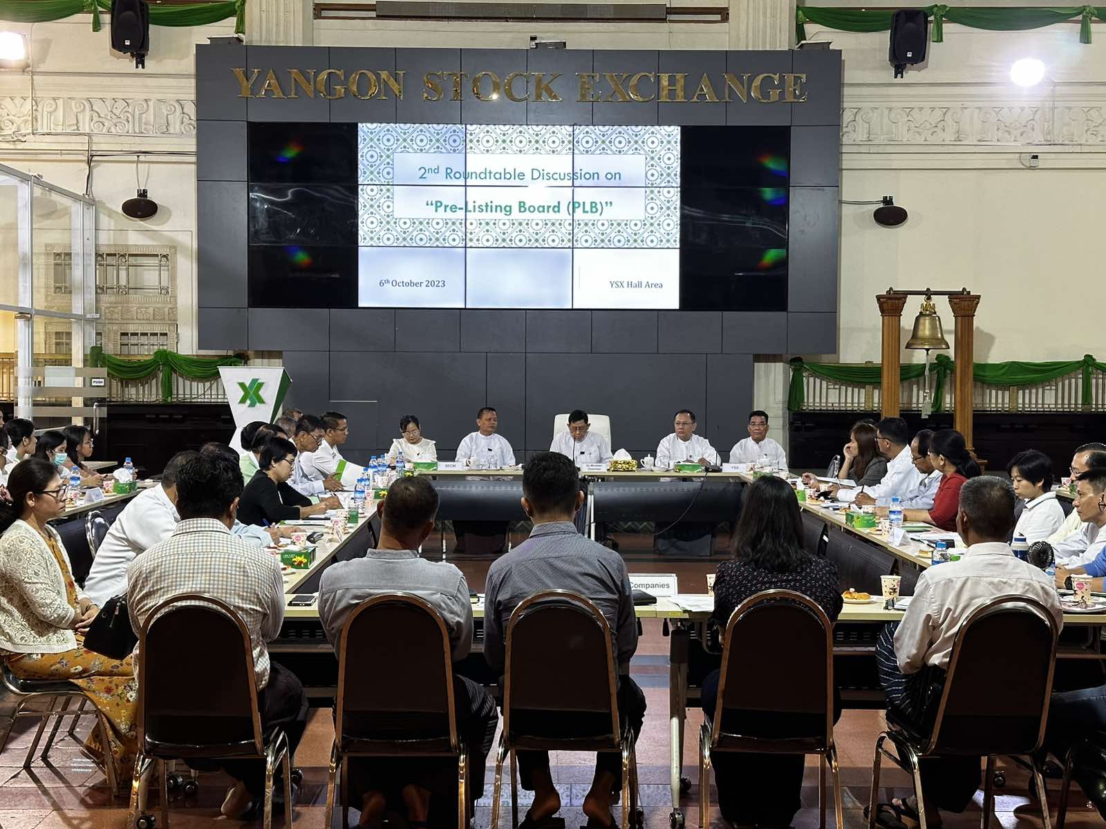 ရန်ကုန်စတော့အိပ်ချိန်း၏ စာရင်းဝင်အကြိုဈေးကွက်တွင် အစုရှယ်ယာရှင် (၁၀၀)ဦးနှင့်အထက် အများပိုင်ကုမ္ပဏီများက လွယ်ကူစွာဝင်ရောက်မှတ်ပုံတင်နိုင်ရေးအတွက် စာရင်းဝင် အကြို ဈေးကွက်ဆိုင်ရာ စကားဝိုင်းဆွေးနွေးပွဲ (Roundtable Discussion on Pre – Listing Board PLB) ကို ယနေ့မွန်းလွဲပိုင်းတွင် ရန်ကုန်စတော့အိပ်ချိန်းပင်မခန်းမ၌ ကျင်းပသည်။