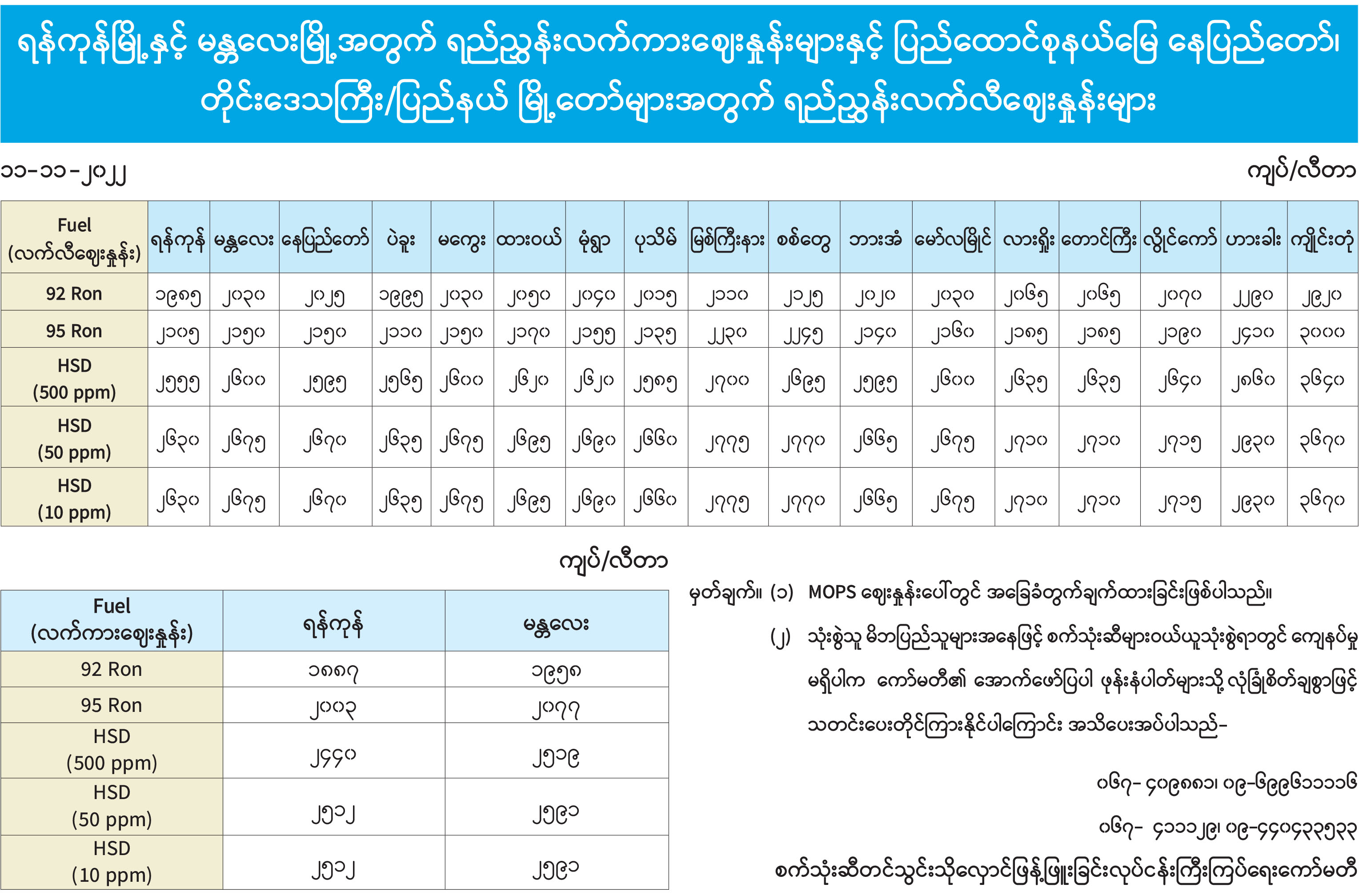 ရန်ကုန်မြို့နှင့် မန္တလေးမြို့အတွက် ရည်ညွှန်းလက်ကား ဈေးနှုန်းများနှင့် ပြည်ထောင်စုနယ်မြေ နေပြည်တော်၊ တိုင်းဒေသကြီး/ ပြည်နယ် မြို့တော်များအတွက် ရည်ညွှန်းလက်လီဈေးနှုန်းများ