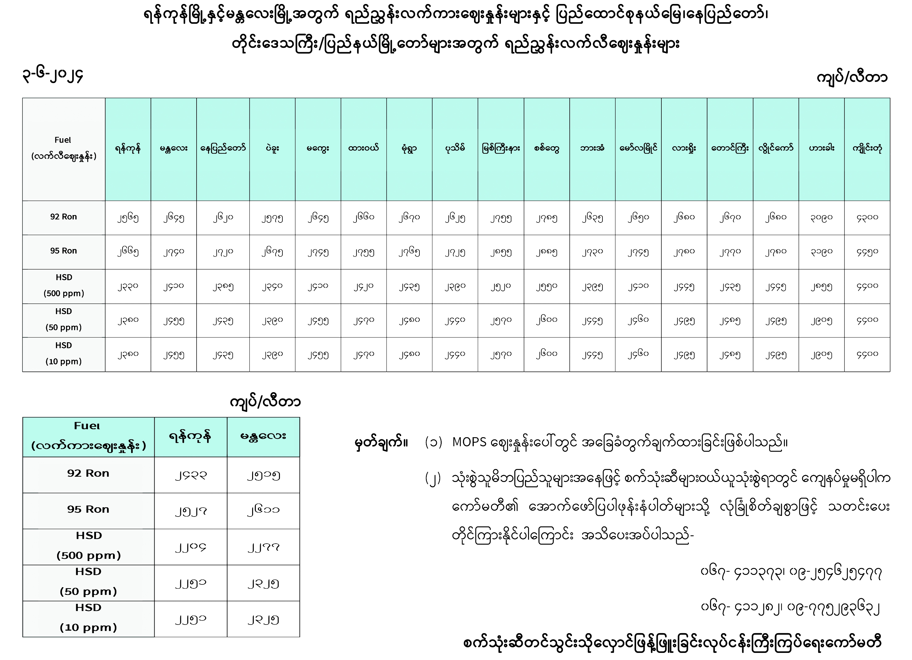 ရန်ကုန်မြို့နှင့် မန္တလေးမြို့အတွက် ရည်ညွှန်းလက်ကားဈေးနှုန်းများနှင့် ပြည်ထောင်စု နယ်မြေ နေပြည်တော်၊ တိုင်းဒေသကြီး/ ပြည်နယ် မြို့တော်များအတွက် ရည်ညွှန်းလက်လီဈေးနှုန်းများ