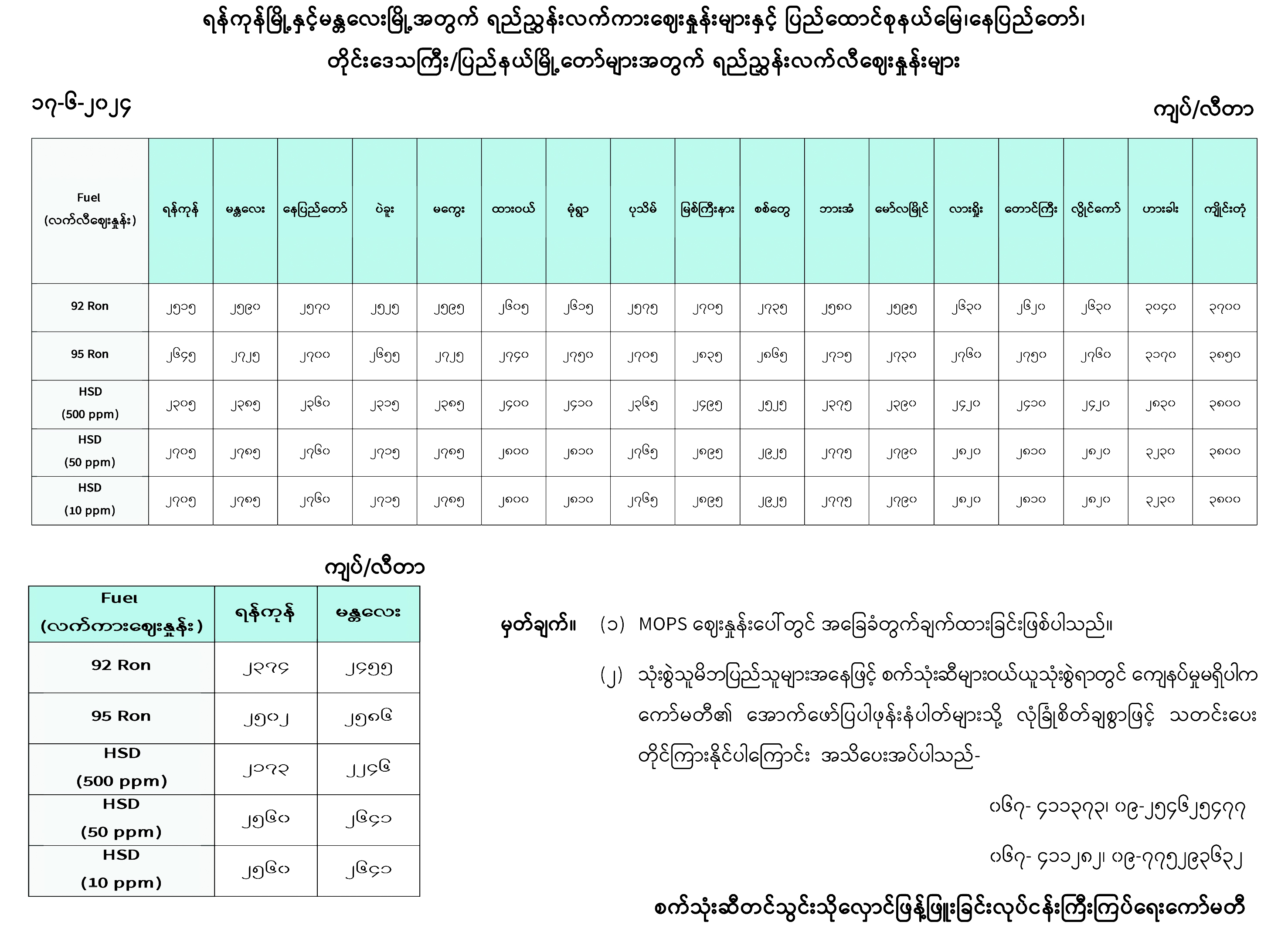 ရန်ကုန်မြို့နှင့် မန္တလေးမြို့အတွက် ရည်ညွှန်းလက်ကားဈေးနှုန်းများနှင့် ပြည်ထောင်စု နယ်မြေ နေပြည်တော်၊ တိုင်းဒေသကြီး/ ပြည်နယ် မြို့တော်များအတွက် ရည်ညွှန်းလက်လီဈေးနှုန်းများ