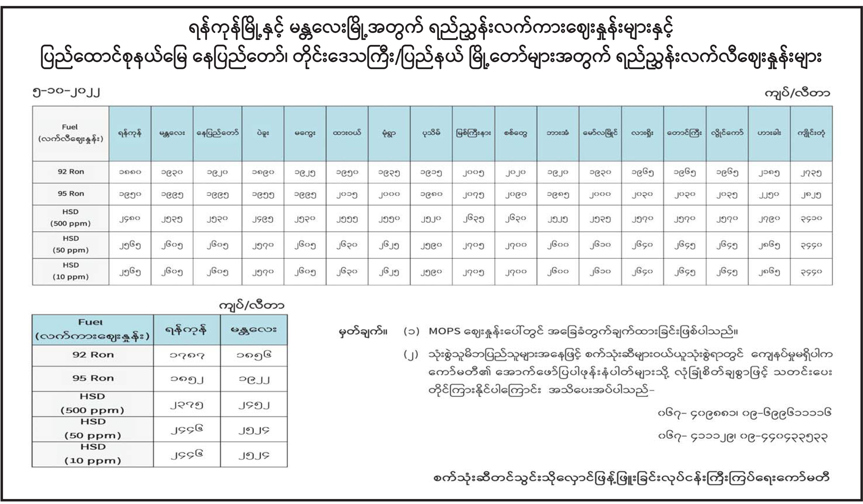 ရန်ကုန်မြို့နှင့် မန္တလေးမြို့အတွက် ရည်ညွှန်းလက်ကားဈေးနှုန်းများနှင့် ပြည်ထောင်စုနယ်မြေ နေပြည်တော်၊ တိုင်းဒေသကြီး/ပြည်နယ် မြို့တော်များအတွက် ရည်ညွှန်းလက်လီဈေးနှုန်းများ