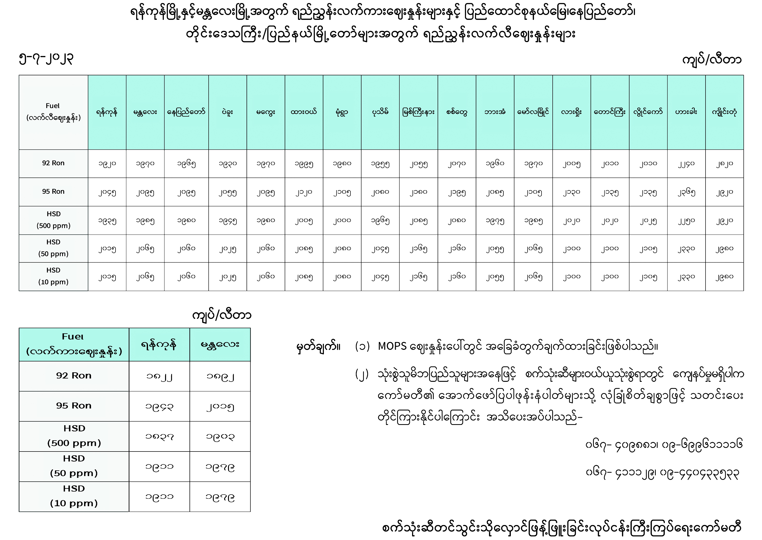 ရန်ကုန်မြို့နှင့် မန္တလေးမြို့အတွက် ရည်ညွှန်းလက်ကားဈေးနှုန်းများနှင့် ပြည်ထောင်စုနယ်မြေ နေပြည်တော်၊ တိုင်းဒေသကြီး/ပြည်နယ် မြို့တော်များအတွက် ရည်ညွှန်းလက်လီဈေးနှုန်းများ