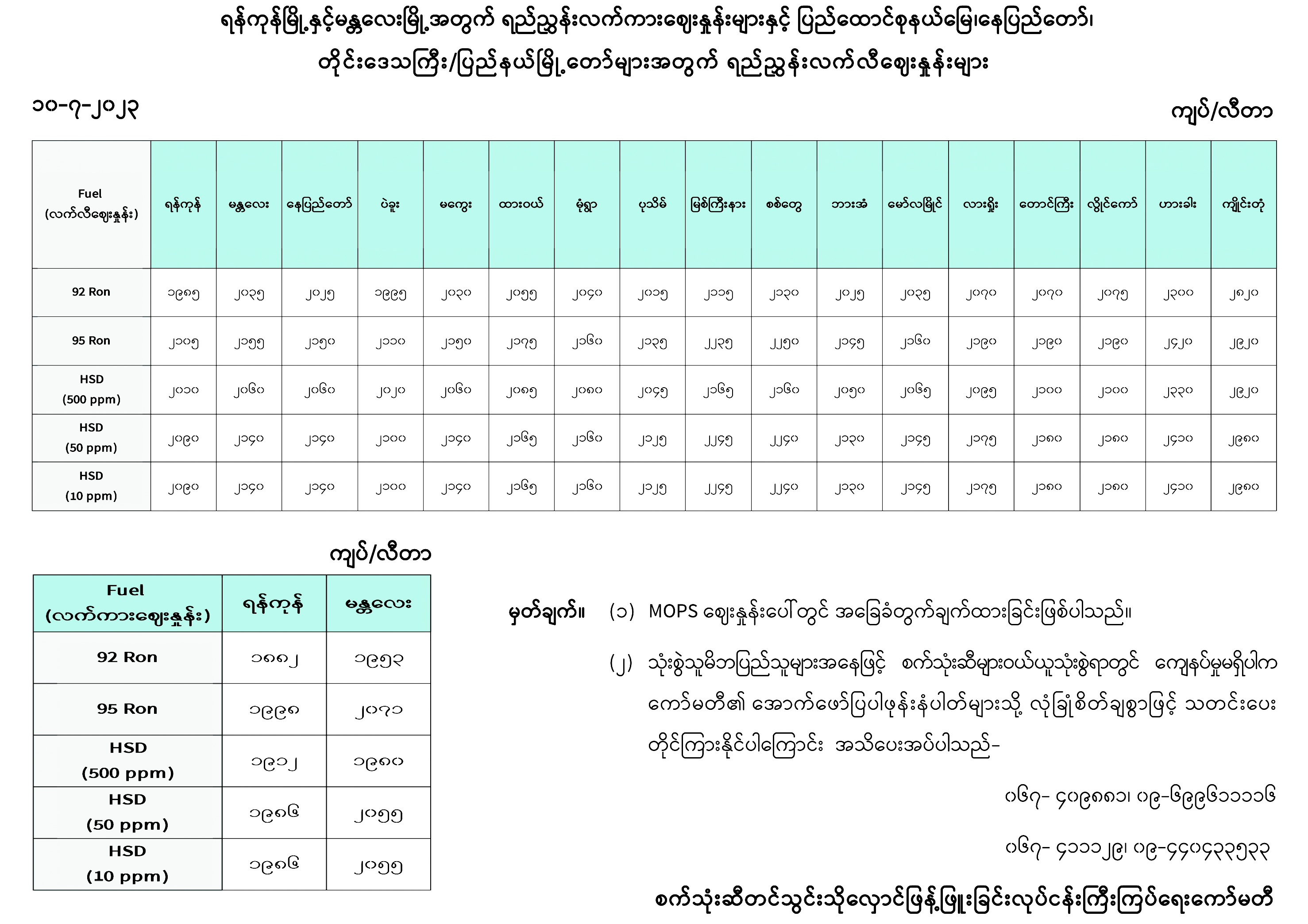 ရန်ကုန်မြို့နှင့် မန္တလေးမြို့အတွက် ရည်ညွှန်းလက်ကားဈေးနှုန်းများနှင့် ပြည်ထောင်စုနယ်မြေ နေပြည်တော်၊ တိုင်းဒေသကြီး/ပြည်နယ် မြို့တော်များအတွက် ရည်ညွှန်းလက်လီဈေးနှုန်းများ