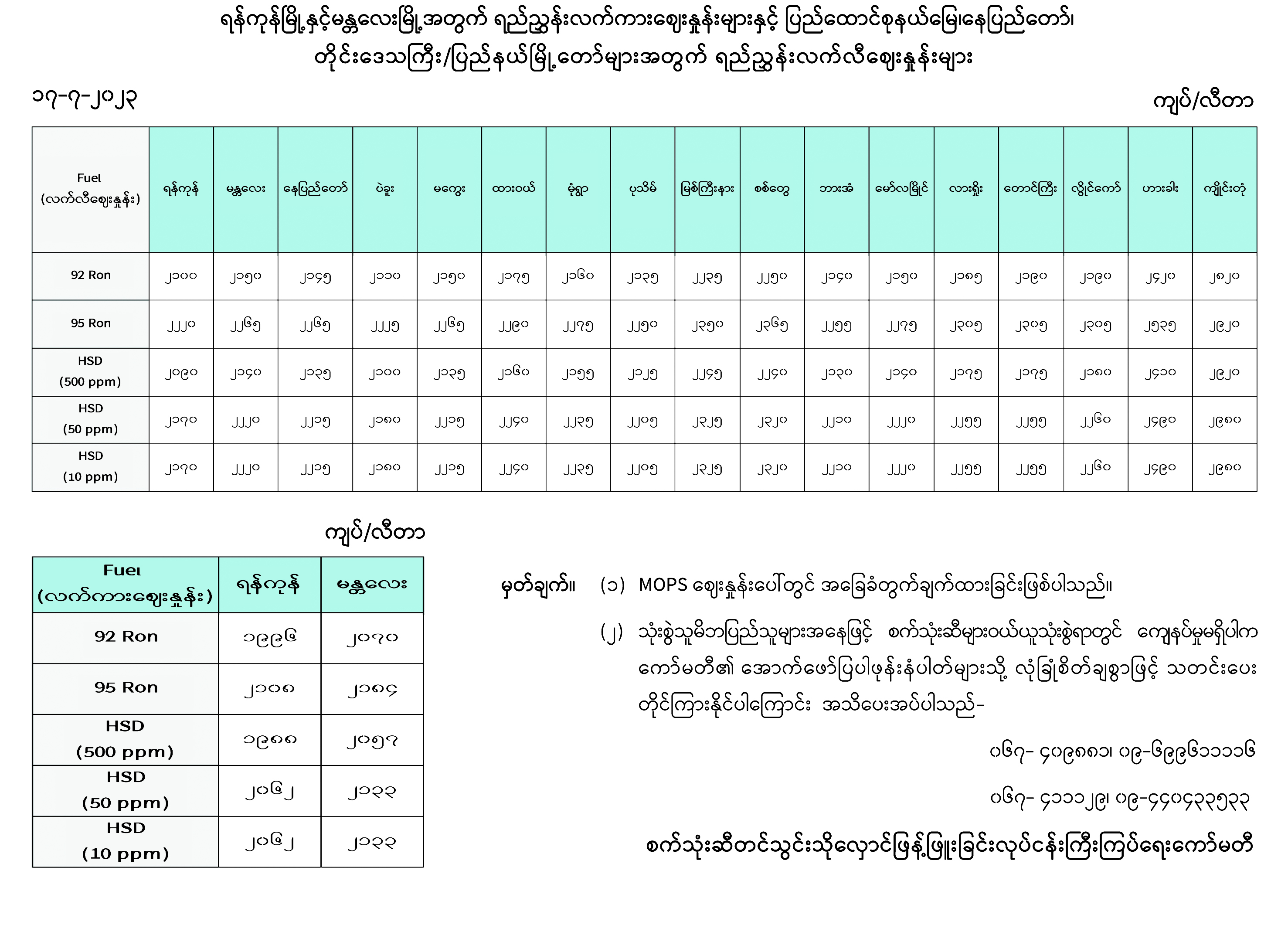ရန်ကုန်မြို့နှင့် မန္တလေးမြို့အတွက် ရည်ညွှန်းလက်ကားဈေးနှုန်းများနှင့် ပြည်ထောင်စုနယ်မြေ နေပြည်တော်၊ တိုင်းဒေသကြီး/ပြည်နယ် မြို့တော်များအတွက် ရည်ညွှန်းလက်လီဈေးနှုန်းများ