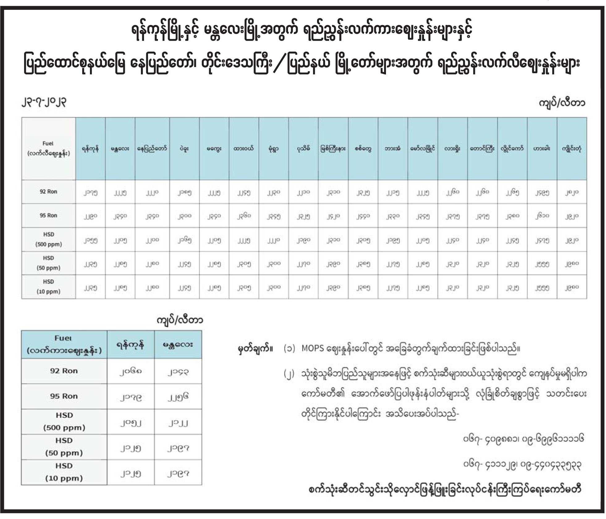 ရန်ကုန်မြို့နှင့် မန္တလေးမြို့အတွက် ရည်ညွှန်းလက်ကားဈေးနှုန်းများနှင့် ပြည်ထောင်စုနယ်မြေ နေပြည်တော်၊ တိုင်းဒေသကြီး/ပြည်နယ် မြို့တော်များအတွက် ရည်ညွှန်းလက်လီဈေးနှုန်းများ