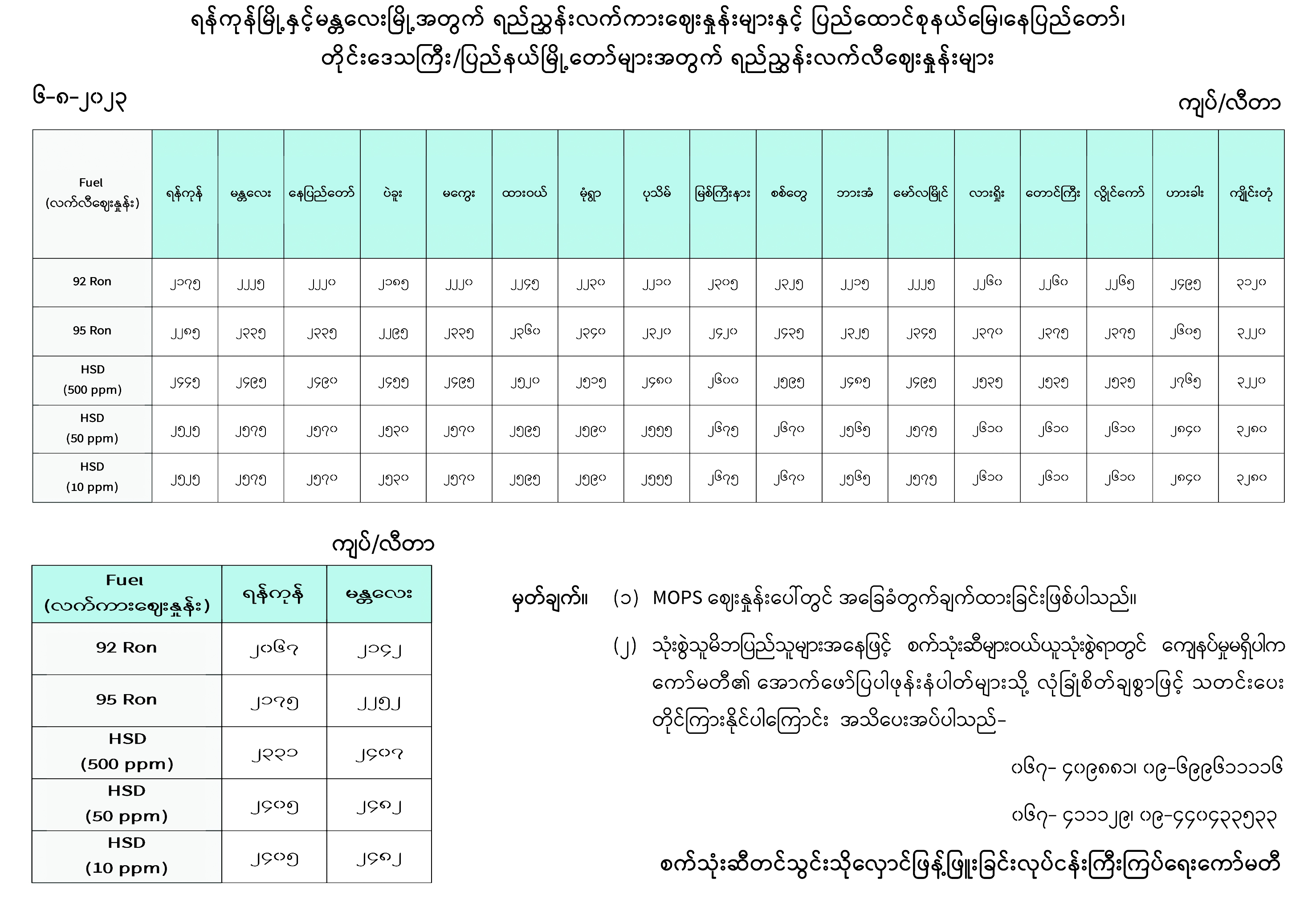 ရန်ကုန်မြို့နှင့် မန္တလေးမြို့အတွက် ရည်ညွှန်းလက်ကားဈေးနှုန်းများနှင့် ပြည်ထောင်စုနယ်မြေ နေပြည်တော်၊ တိုင်းဒေသကြီး/ပြည်နယ် မြို့တော်များအတွက် ရည်ညွှန်းလက်လီဈေးနှုန်းများ