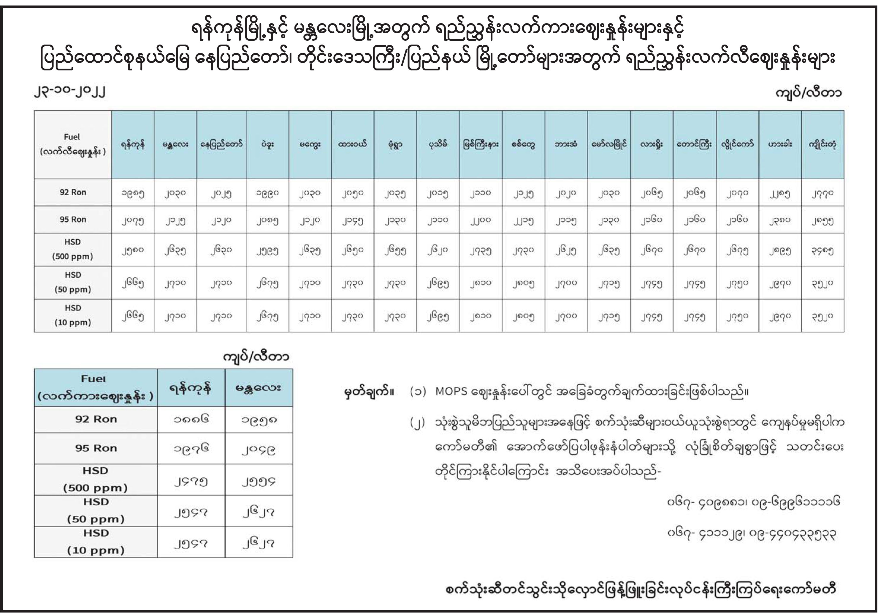 ရန်ကုန်မြို့နှင့် မန္တလေးမြို့အတွက် ရည်ညွှန်းလက်ကားဈေးနှုန်းများနှင့် ပြည်ထောင်စုနယ်မြေ နေပြည်တော်၊ တိုင်းဒေသကြီး/ပြည်နယ် မြို့တော်များအတွက် ရည်ညွှန်းလက်လီဈေးနှုန်းများ