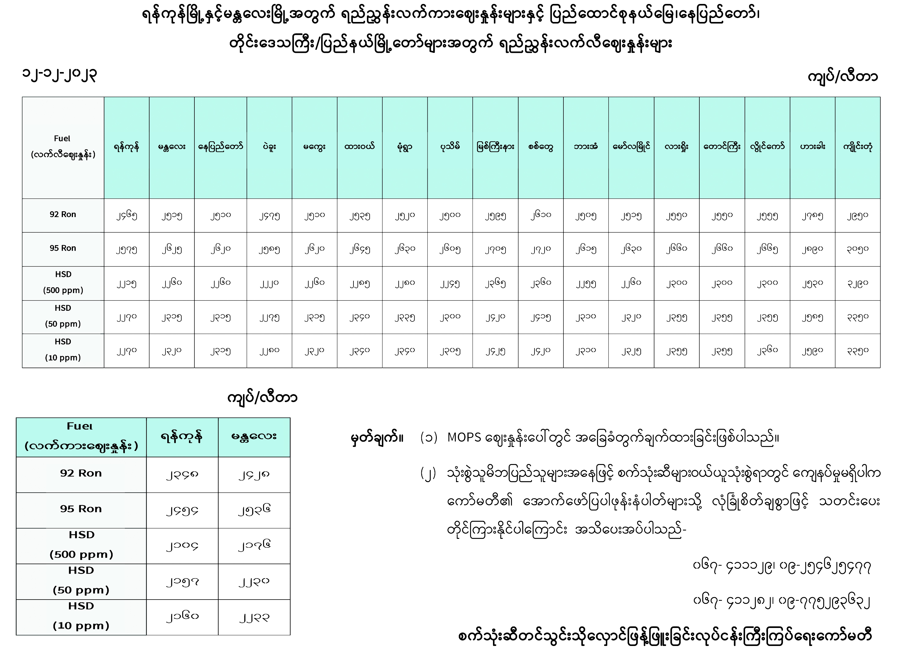 ရန်ကုန်မြို့နှင့် မန္တလေးမြို့အတွက် ရည်ညွှန်းလက်ကားဈေးနှုန်းများနှင့် ပြည်ထောင်စုနယ်မြေ နေပြည်တော်၊ တိုင်းဒေသကြီး/ပြည်နယ် မြို့တော်များအတွက် ရည်ညွှန်းလက်လီဈေးနှုန်းများ
