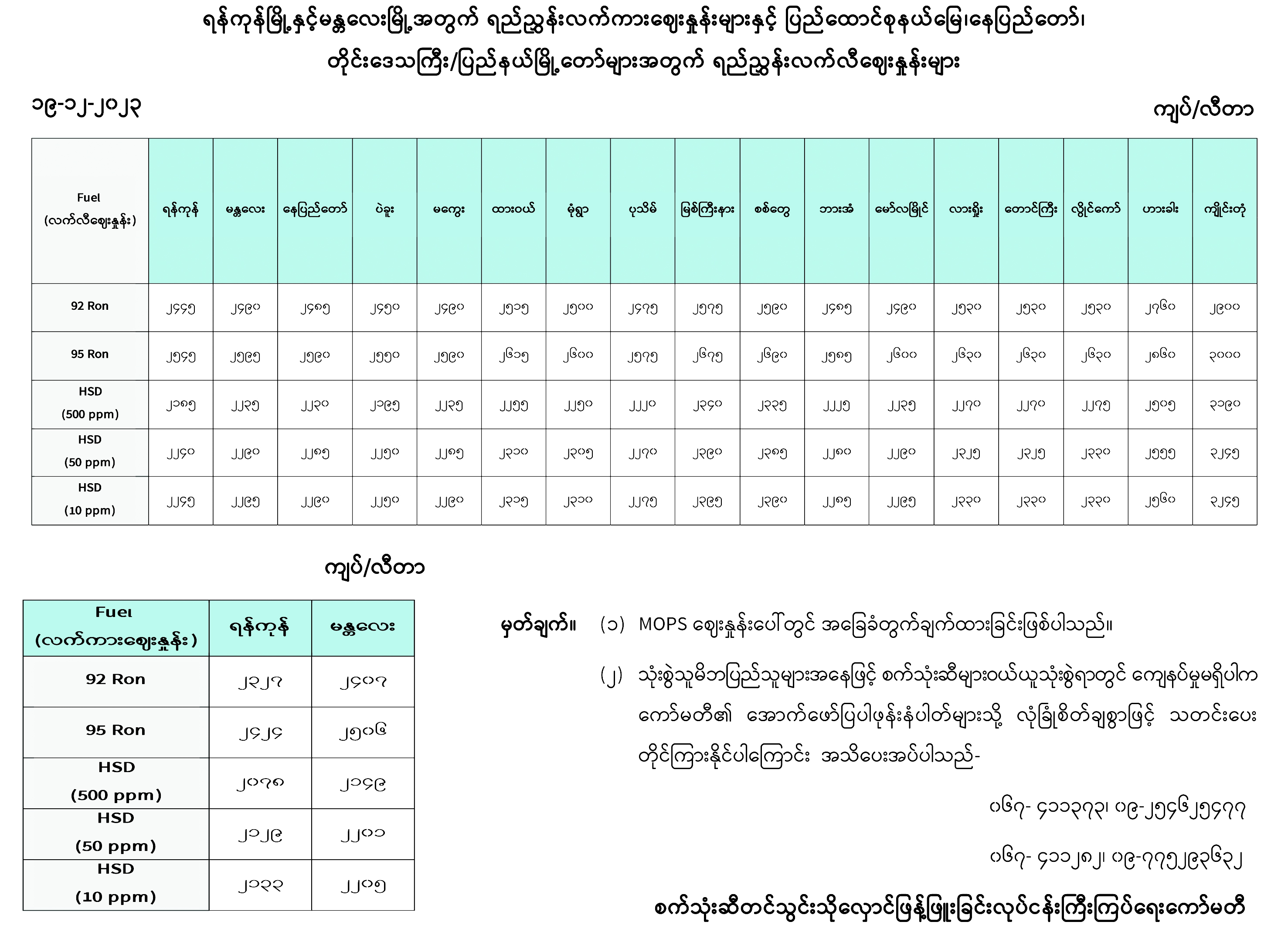 ရန်ကုန်မြို့နှင့် မန္တလေးမြို့အတွက် ရည်ညွှန်းလက်ကားဈေးနှုန်းများနှင့် ပြည်ထောင်စုနယ်မြေ နေပြည်တော်၊ တိုင်းဒေသကြီး/ပြည်နယ် မြို့တော်များအတွက် ရည်ညွှန်းလက်လီဈေးနှုန်းများ