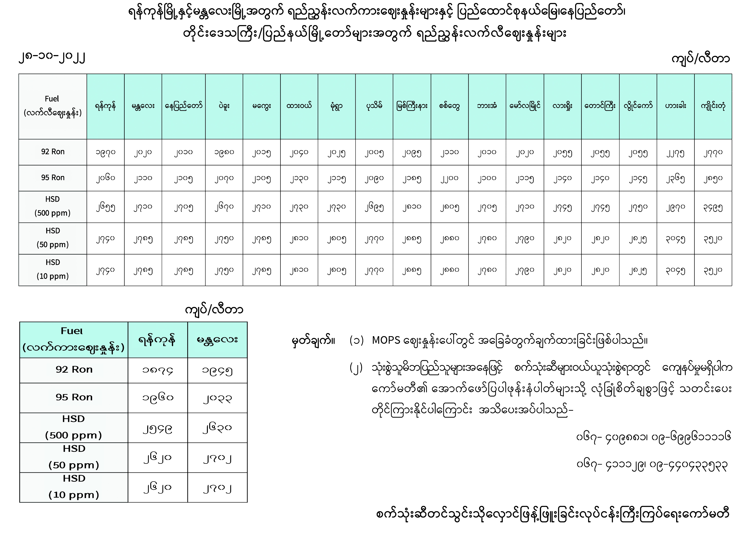 ရန်ကုန်မြို့နှင့် မန္တလေးမြို့အတွက် ရည်ညွှန်းလက်ကားဈေးနှုန်းများနှင့် ပြည်ထောင်စုနယ်မြေ နေပြည်တော်၊ တိုင်းဒေသကြီး/ပြည်နယ် မြို့တော်များအတွက် ရည်ညွှန်းလက်လီဈေးနှုန်းများ