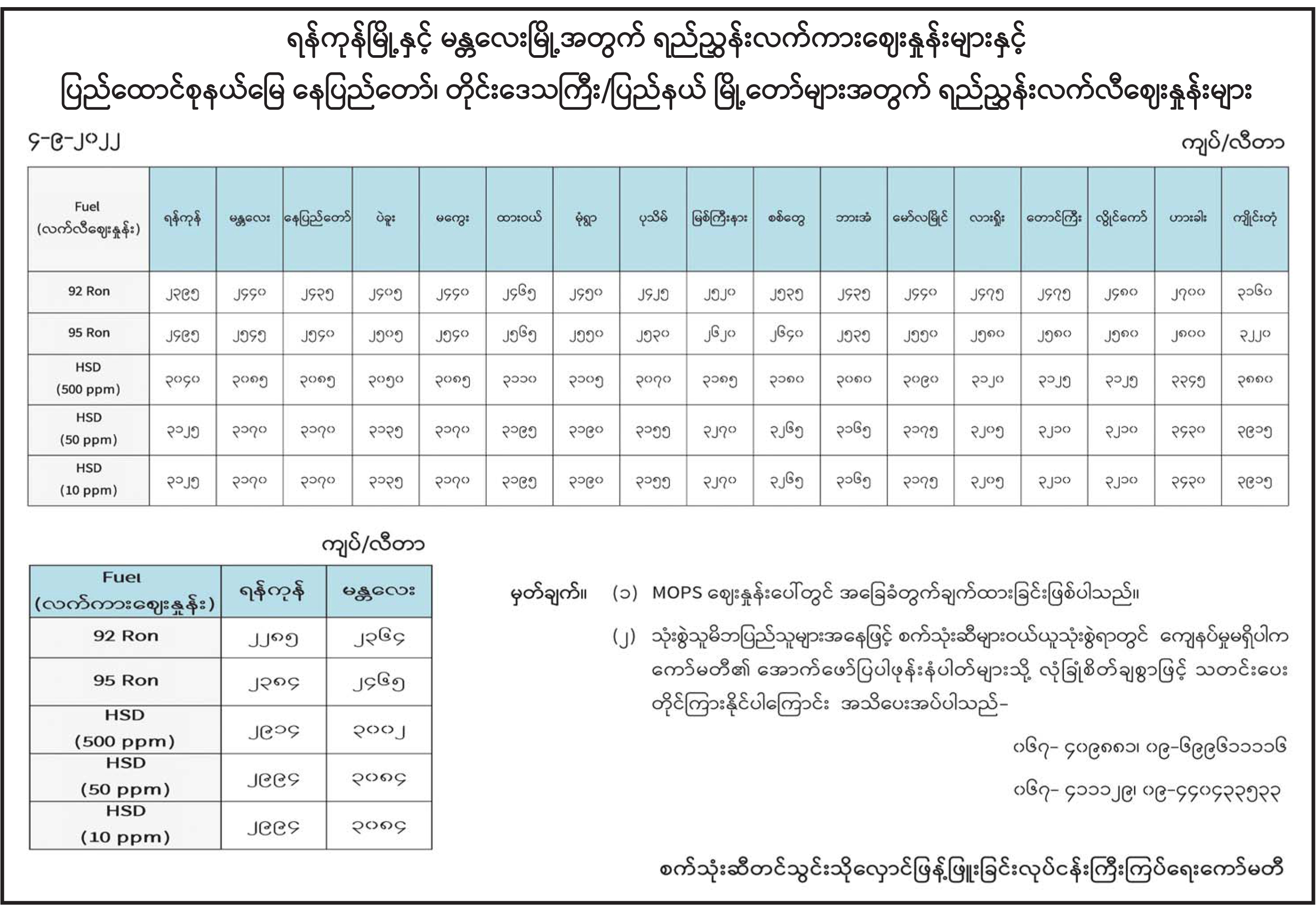 ရန်ကုန်မြို့နှင့် မန္တလေးမြို့အတွက် ရည်ညွှန်းလက်ကားဈေးနှုန်းများနှင့် ပြည်ထောင်စုနယ်မြေ နေပြည်တော်၊ တိုင်းဒေသကြီး/ပြည်နယ်မြို့တော်များအတွက် ရည်ညွှန်းလက်လီဈေးနှုန်းများ