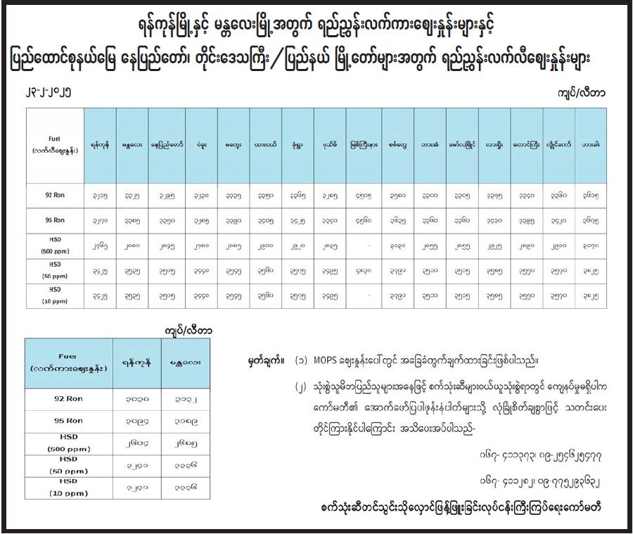 ရန်ကုန်မြို့နှင့် မန္တလေးမြို့အတွက် ရည်ညွှန်းလက်ကားဈေးနှုန်းများနှင့် ပြည်ထောင်စုနယ်မြေ နေပြည်တော်၊ တိုင်းဒေသကြီး/ပြည်နယ် မြို့တော်များအတွက် ရည်ညွှန်းလက်လီဈေးနှုန်းများ
