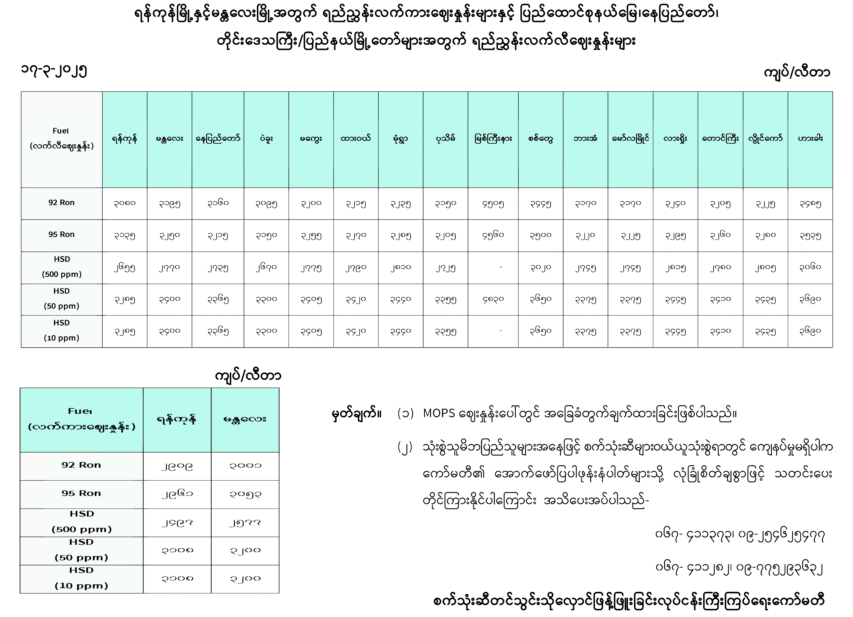 ရန်ကုန်မြို့နှင့် မန္တလေးမြို့အတွက် ရည်ညွှန်းလက်ကားဈေးနှုန်းများနှင့် ပြည်ထောင်စုနယ်မြေ နေပြည်တော်၊ တိုင်းဒေသကြီး/ပြည်နယ် မြို့တော်များအတွက် ရည်ညွှန်းလက်လီဈေးနှုန်းများ