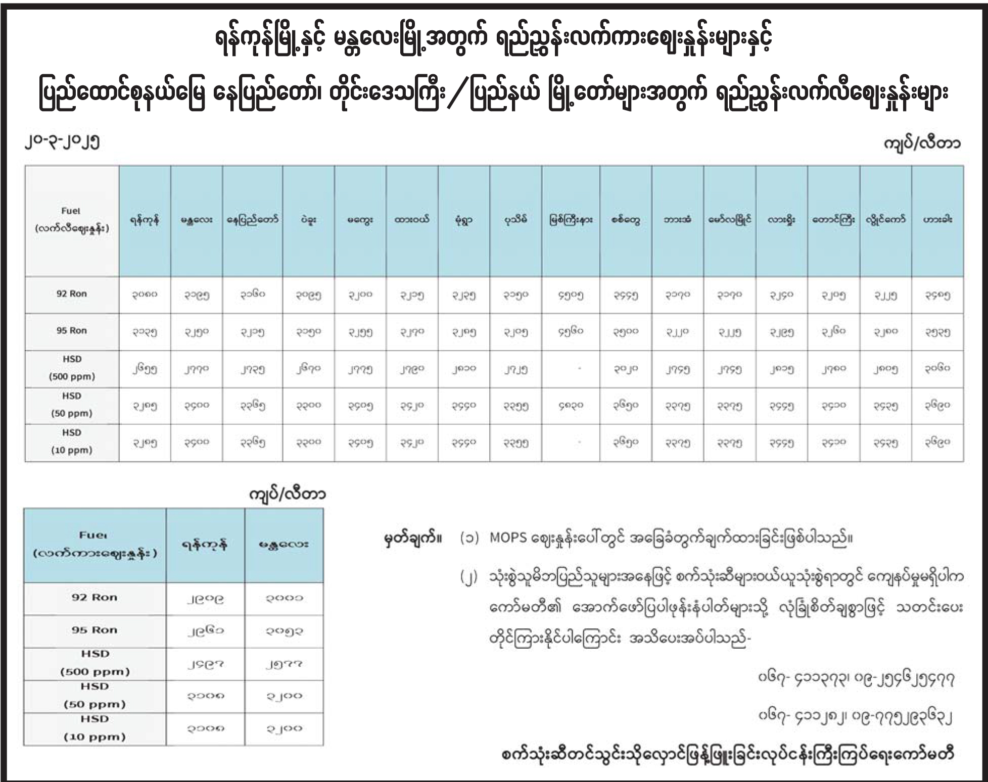 ရန်ကုန်မြို့နှင့် မန္တလေးမြို့အတွက် ရည်ညွှန်းလက်ကားဈေးနှုန်းများနှင့် ပြည်ထောင်စုနယ်မြေ နေပြည်တော်၊ တိုင်းဒေသကြီး/ပြည်နယ် မြို့တော်များအတွက် ရည်ညွှန်းလက်လီဈေးနှုန်းများ