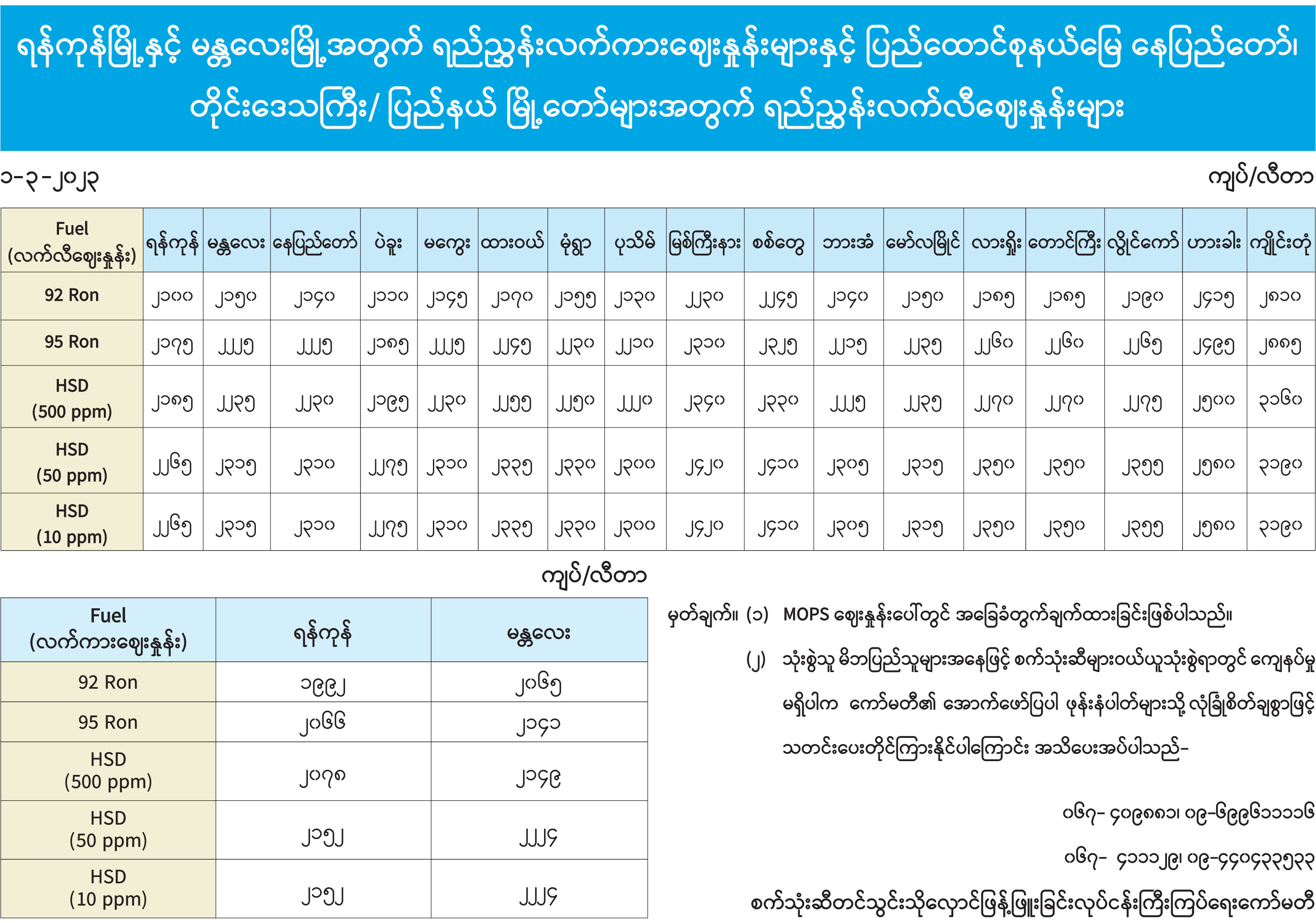 ရန်ကုန်မြို့နှင့် မန္တလေးမြို့အတွက် ရည်ညွှန်းလက်ကားဈေးနှုန်းများနှင့် ပြည်ထောင်စုနယ်မြေ နေပြည်တော်၊ တိုင်းဒေသကြီး/ပြည်နယ် မြို့တော်များအတွက် ရည်ညွှန်းလက်လီဈေးနှုန်းများ