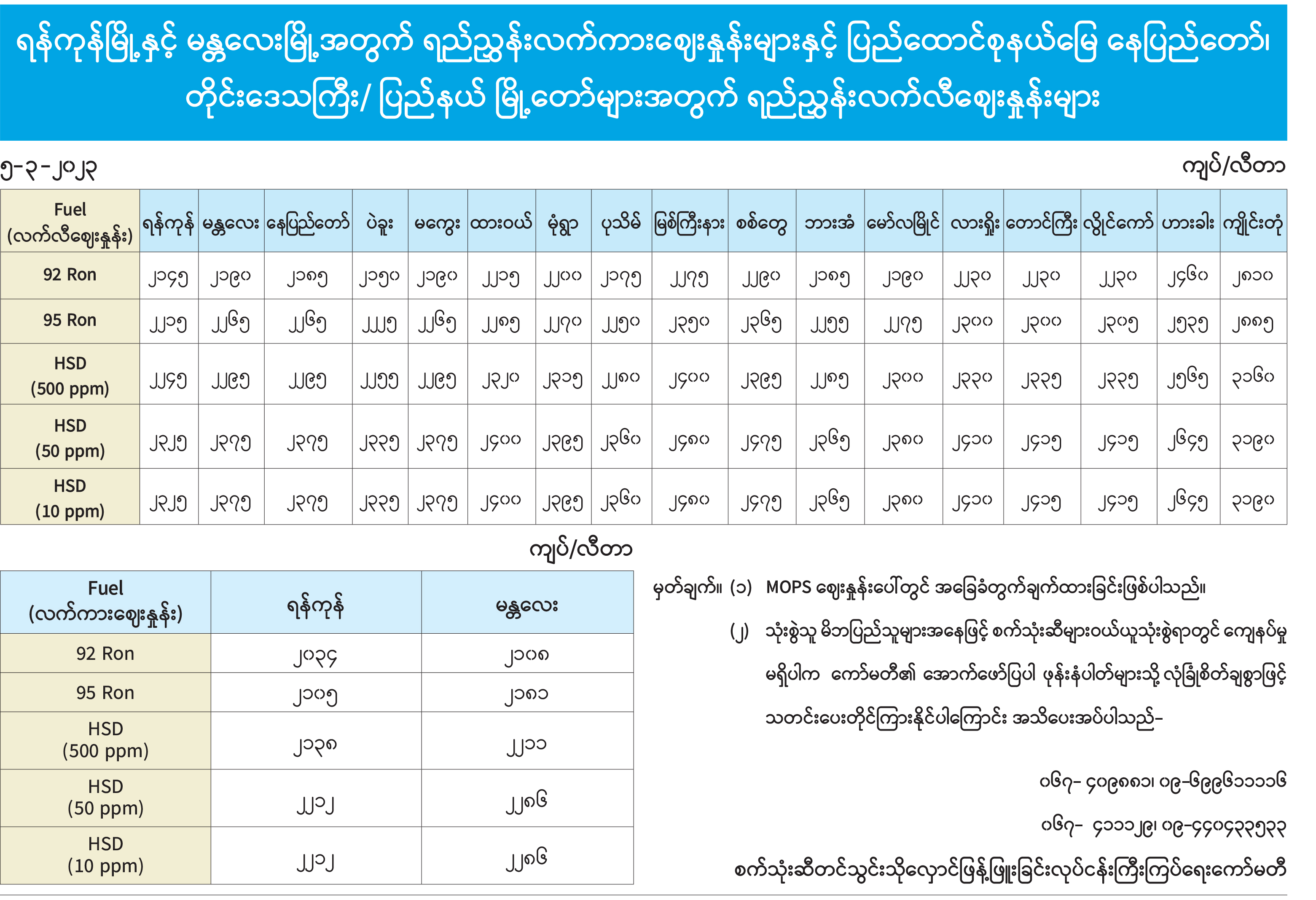 ရန်ကုန်မြို့နှင့် မန္တလေးမြို့အတွက် ရည်ညွှန်းလက်ကားဈေးနှုန်းများနှင့် ပြည်ထောင်စုနယ်မြေ နေပြည်တော်၊ တိုင်းဒေသကြီး/ပြည်နယ် မြို့တော်များအတွက် ရည်ညွှန်းလက်လီဈေးနှုန်းများ