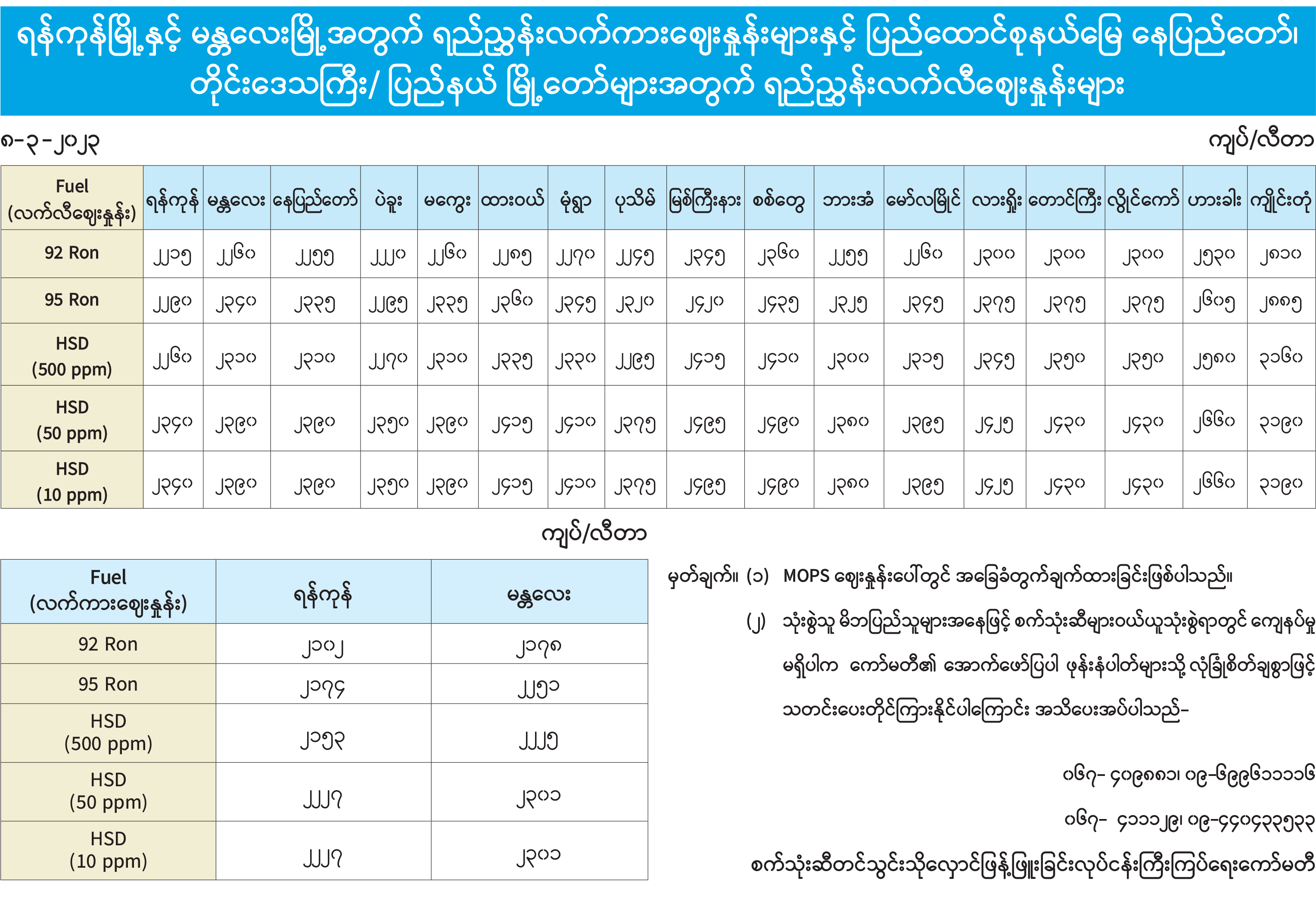 ရန်ကုန်မြို့နှင့် မန္တလေးမြို့အတွက် ရည်ညွှန်းလက်ကားဈေးနှုန်းများနှင့် ပြည်ထောင်စုနယ်မြေ နေပြည်တော်၊ တိုင်းဒေသကြီး/ပြည်နယ် မြို့တော်များအတွက် ရည်ညွှန်းလက်လီဈေးနှုန်းများ