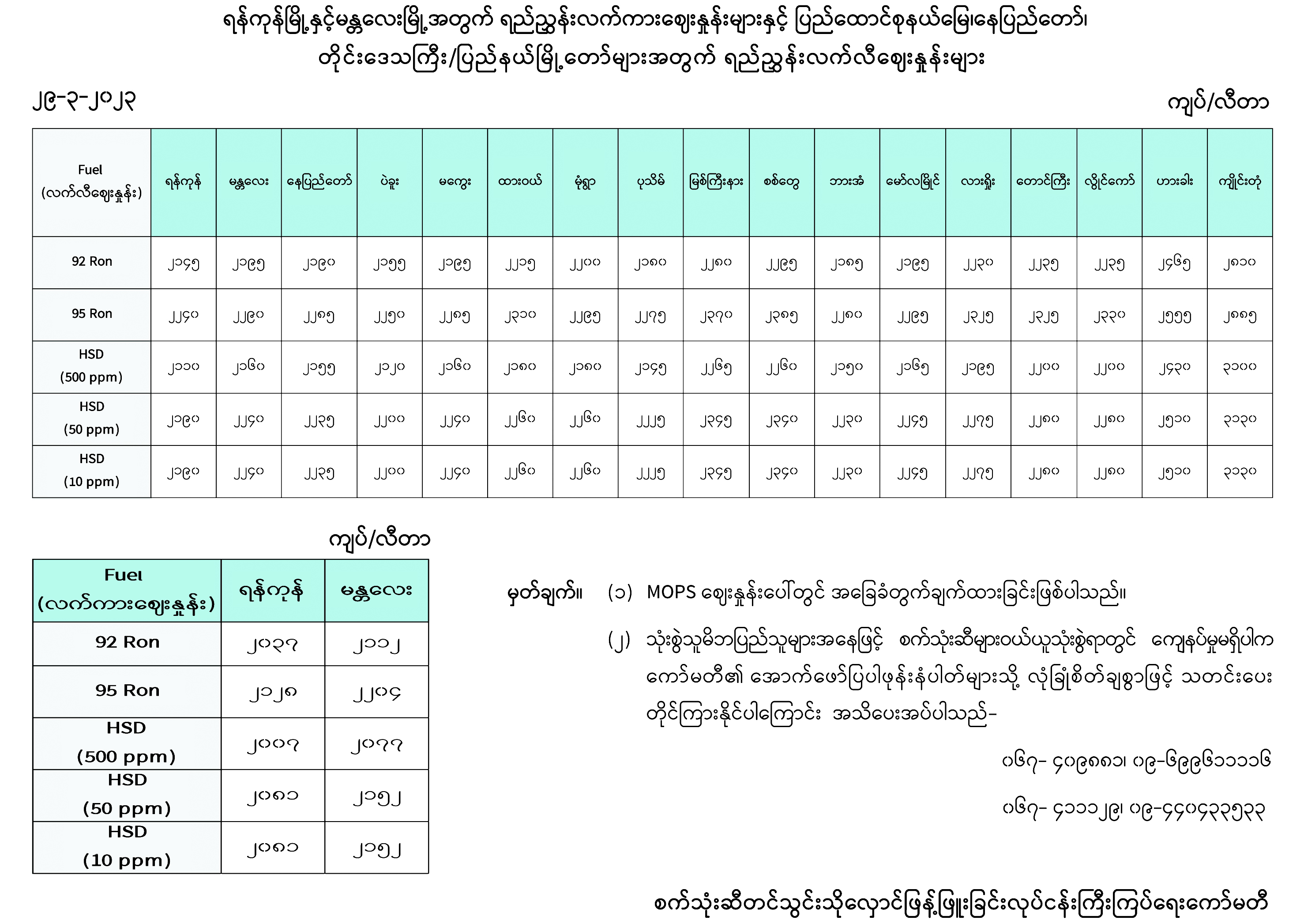 ရန်ကုန်မြို့နှင့် မန္တလေးမြို့အတွက် ရည်ညွှန်းလက်ကားဈေးနှုန်းများနှင့် ပြည်ထောင်စုနယ်မြေ နေပြည်တော်၊ တိုင်းဒေသကြီး/ပြည်နယ် မြို့တော်များအတွက် ရည်ညွှန်းလက်လီဈေးနှုန်းများ