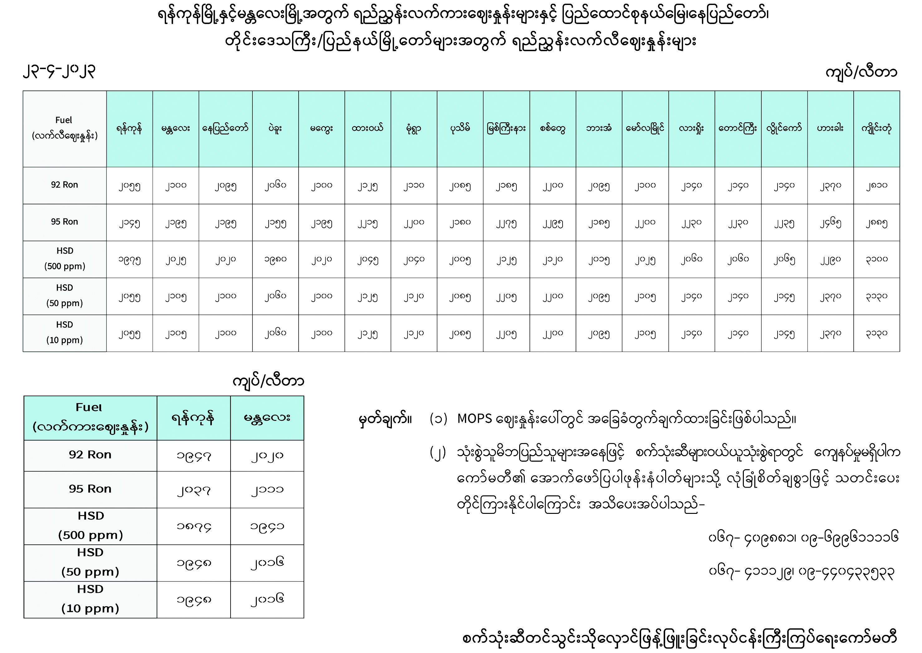 ရန်ကုန်မြို့နှင့် မန္တလေးမြို့အတွက် ရည်ညွှန်းလက်ကားဈေးနှုန်းများနှင့် ပြည်ထောင်စုနယ်မြေ နေပြည်တော်၊ တိုင်းဒေသကြီး/ပြည်နယ် မြို့တော်များအတွက် ရည်ညွှန်းလက်လီဈေးနှုန်းများ