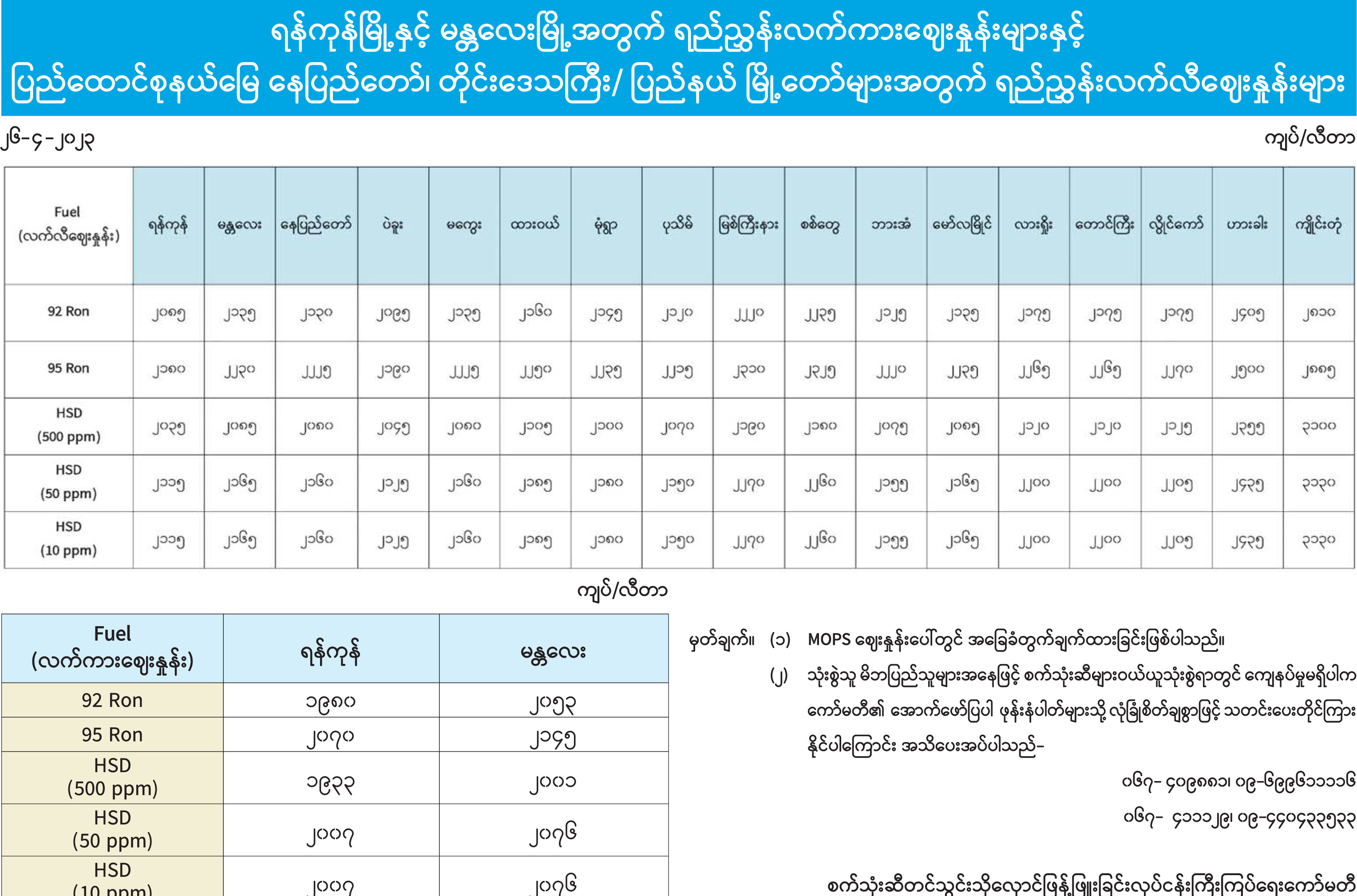 ရန်ကုန်မြို့နှင့် မန္တလေးမြို့အတွက် ရည်ညွှန်းလက်ကားဈေးနှုန်းများနှင့် ပြည်ထောင်စုနယ်မြေ နေပြည်တော်၊ တိုင်းဒေသကြီး/ပြည်နယ် မြို့တော်များအတွက် ရည်ညွှန်းလက်လီဈေးနှုန်းများ