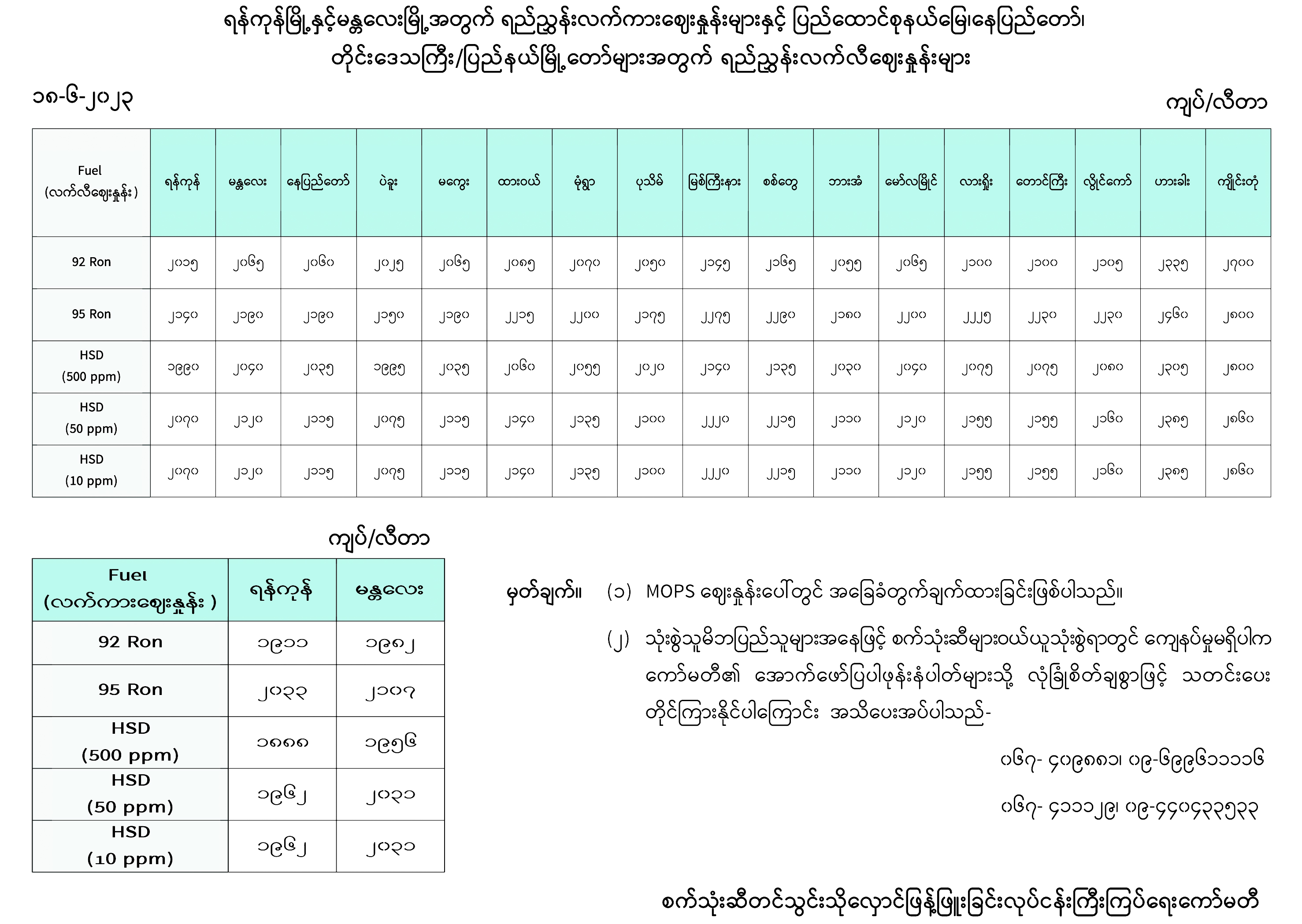 ရန်ကုန်မြို့နှင့် မန္တလေးမြို့အတွက် ရည်ညွှန်းလက်ကားဈေးနှုန်းများနှင့် ပြည်ထောင်စုနယ်မြေ နေပြည်တော်၊ တိုင်းဒေသကြီး/ပြည်နယ် မြို့တော်များအတွက် ရည်ညွှန်းလက်လီဈေးနှုန်းများ