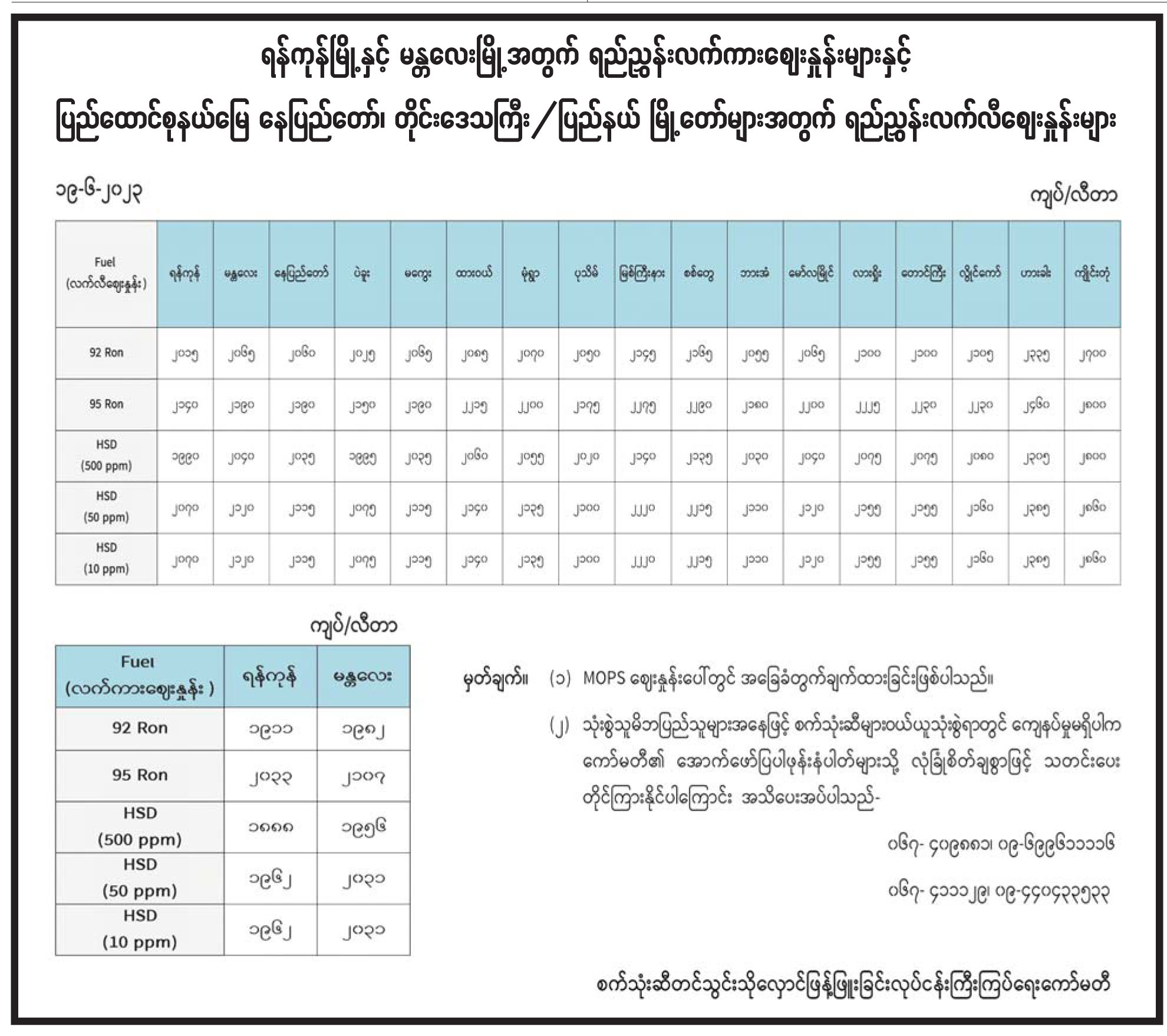 ရန်ကုန်မြို့နှင့် မန္တလေးမြို့အတွက် ရည်ညွှန်းလက်ကားဈေးနှုန်းများနှင့် ပြည်ထောင်စုနယ်မြေ နေပြည်တော်၊ တိုင်းဒေသကြီး/ပြည်နယ် မြို့တော်များအတွက် ရည်ညွှန်းလက်လီဈေးနှုန်းများ
