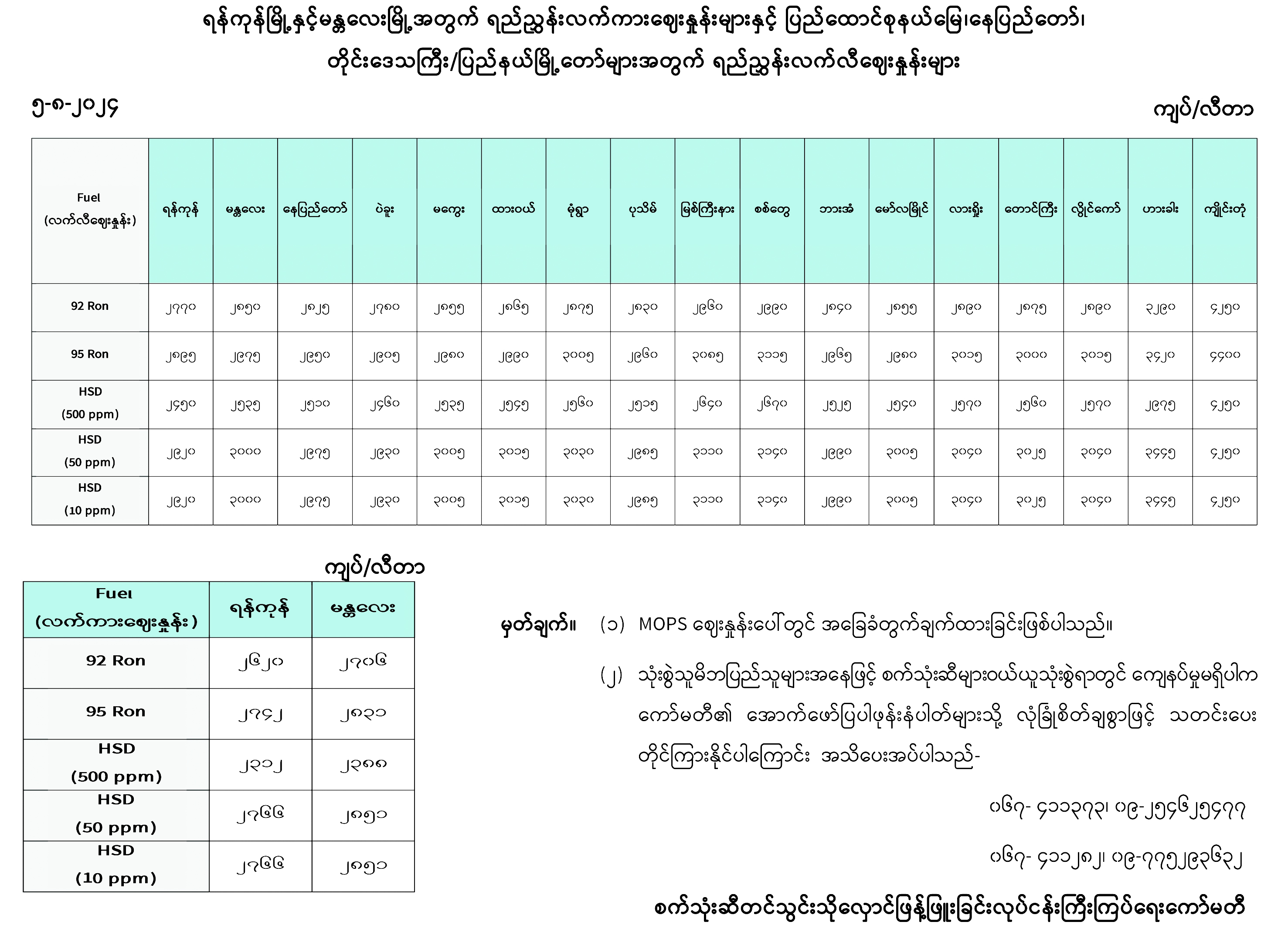 ရန်ကုန်မြို့နှင့် မန္တလေးမြို့အတွက် ရည်ညွှန်းလက်ကားဈေးနှုန်းများနှင့် ပြည်ထောင်စုနယ်မြေ နေပြည်တော်၊ တိုင်းဒေသကြီး/ ပြည်နယ် မြို့တော်များအတွက် ရည်ညွှန်းလက်လီဈေးနှုန်းများ