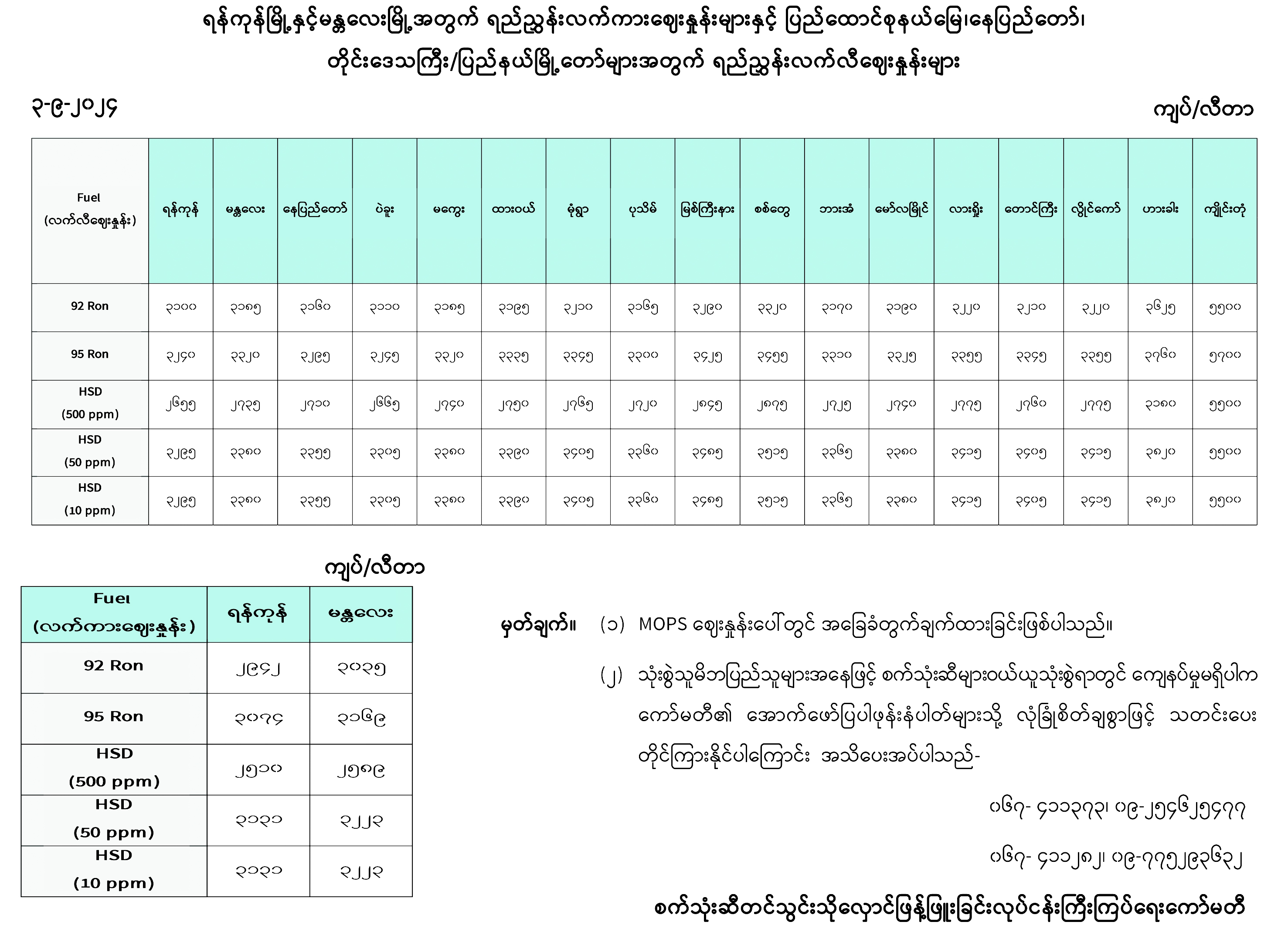 ရန်ကုန်မြို့နှင့် မန္တလေးမြို့အတွက် ရည်ညွှန်းလက်ကားဈေးနှုန်းများနှင့် ပြည်ထောင်စုနယ်မြေ နေပြည်တော်၊ တိုင်းဒေသကြီး/ ပြည်နယ် မြို့တော်များအတွက် ရည်ညွှန်းလက်လီဈေးနှုန်းများ